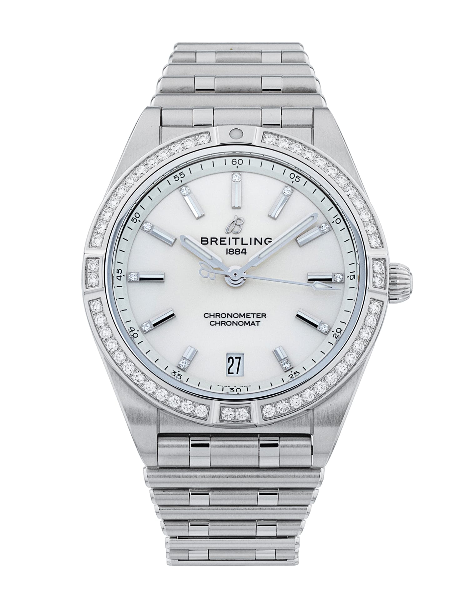 This Breitling Chronomat Automatic 36 A10380 has a silver diamond dial and a bracelet strap. This Breitling has undergone a thorough inspection of water resistance, accuracy, functionality and condition to determine the level of reconditioning required to meet our strict standards. It has also been referenced against technical documents and manufacturer records where available to ensure authenticity and a clean history. All our watches have a 24-month warranty for your peace of mind.