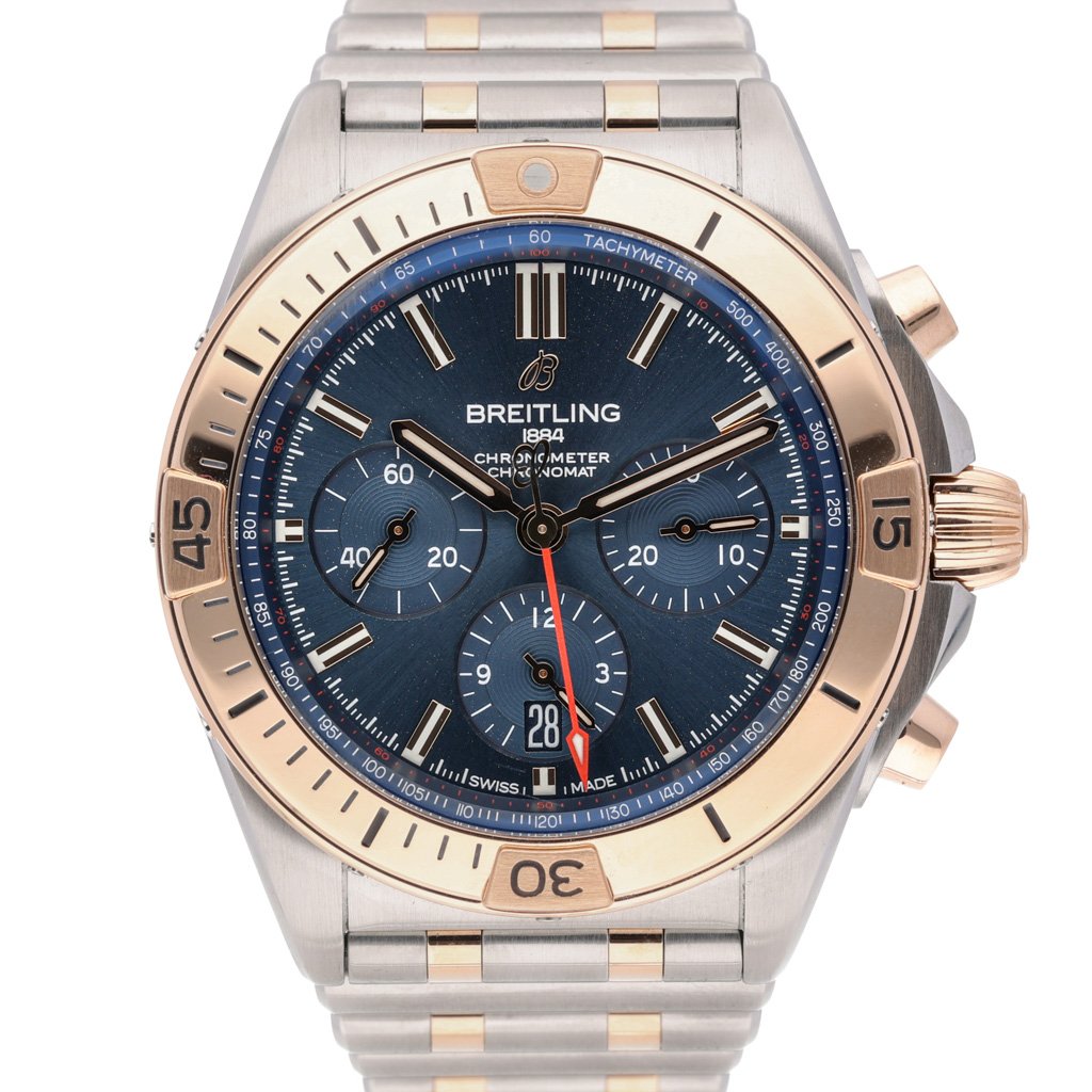 This Breitling Chronomat B01 42 UB0134 has a blue baton dial and a bracelet strap. This Breitling has undergone a thorough inspection of water resistance, accuracy, functionality and condition to determine the level of reconditioning required to meet our strict standards. It has also been referenced against technical documents and manufacturer records where available to ensure authenticity and a clean history. All our watches have a 24-month warranty for your peace of mind.