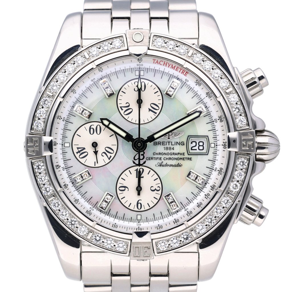 This Breitling Chronomat Evolution A13356 has a mother of pearl white - diamond dial and a bracelet strap. This Breitling has undergone a thorough inspection of water resistance, accuracy, functionality and condition to determine the level of reconditioning required to meet our strict standards. It has also been referenced against technical documents and manufacturer records where available to ensure authenticity and a clean history. All our watches have a 24-month warranty for your peace of mind.