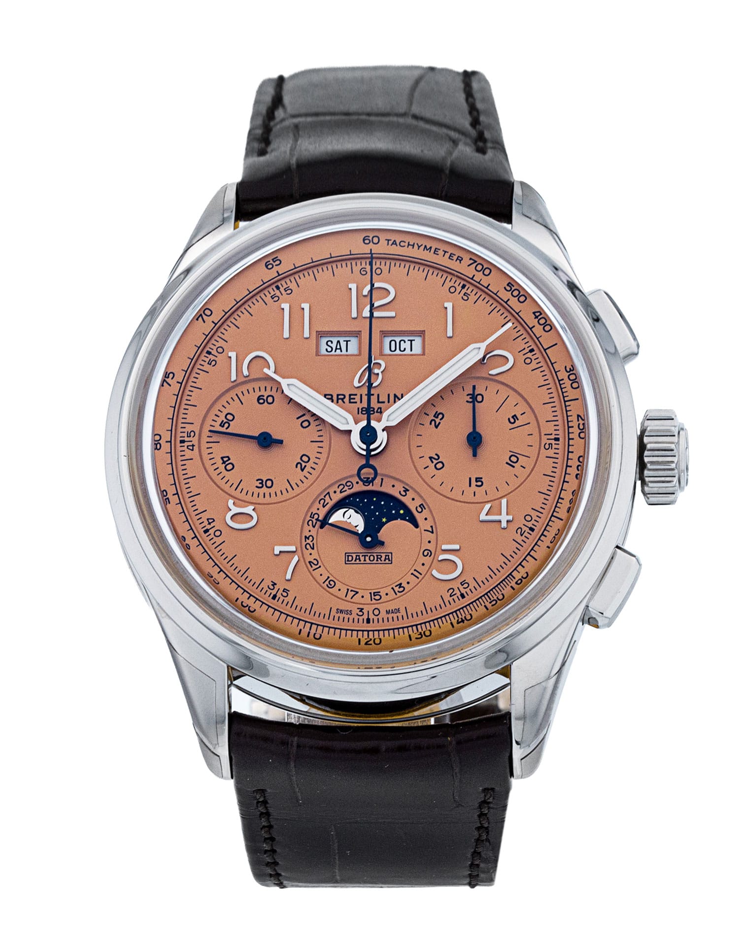 This Breitling Datora AB2510 has a copper arabic dial and a leather strap. This Breitling has undergone a thorough inspection of water resistance, accuracy, functionality and condition to determine the level of reconditioning required to meet our strict standards. It has also been referenced against technical documents and manufacturer records where available to ensure authenticity and a clean history. Our watches have a 24-month warranty for your peace of mind, in conjunction with any remaining manufacturer’s warranty from new or from service.