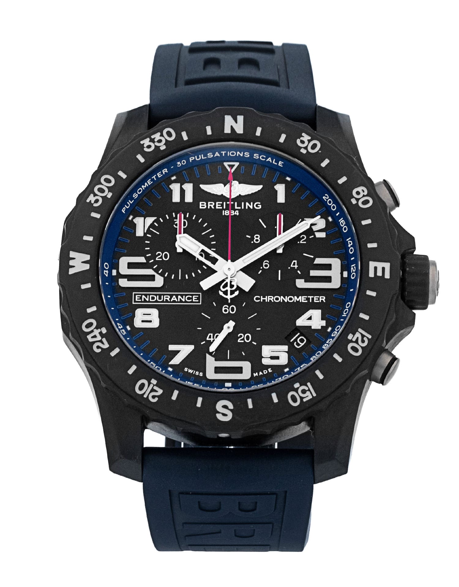 This Breitling Endurance Pro X82310 has a black arabic dial and a rubber strap. This Breitling has undergone a thorough inspection of water resistance, accuracy, functionality and condition to determine the level of reconditioning required to meet our strict standards. It has also been referenced against technical documents and manufacturer records where available to ensure authenticity and a clean history. All our watches have a 24-month warranty for your peace of mind.