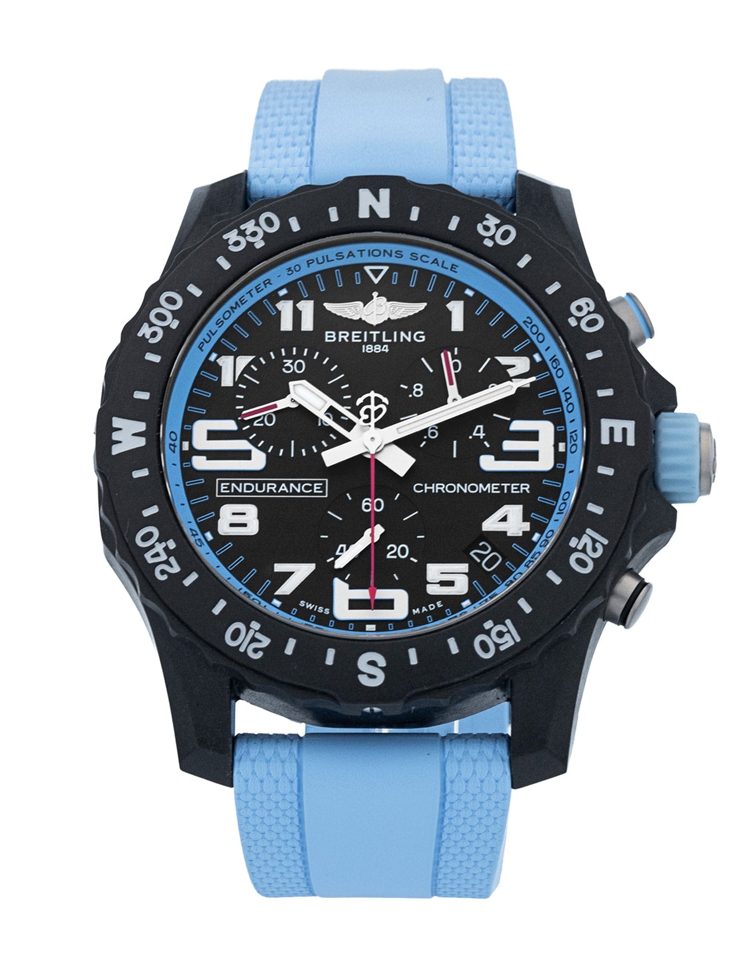 This Breitling Endurance Pro X82310 has a black arabic dial and a rubber strap. This Breitling has undergone a thorough inspection of water resistance, accuracy, functionality and condition to determine the level of reconditioning required to meet our strict standards. It has also been referenced against technical documents and manufacturer records where available to ensure authenticity and a clean history. Our watches have a 24-month warranty for your peace of mind, in conjunction with any remaining manufacturer’s warranty from new or from service.