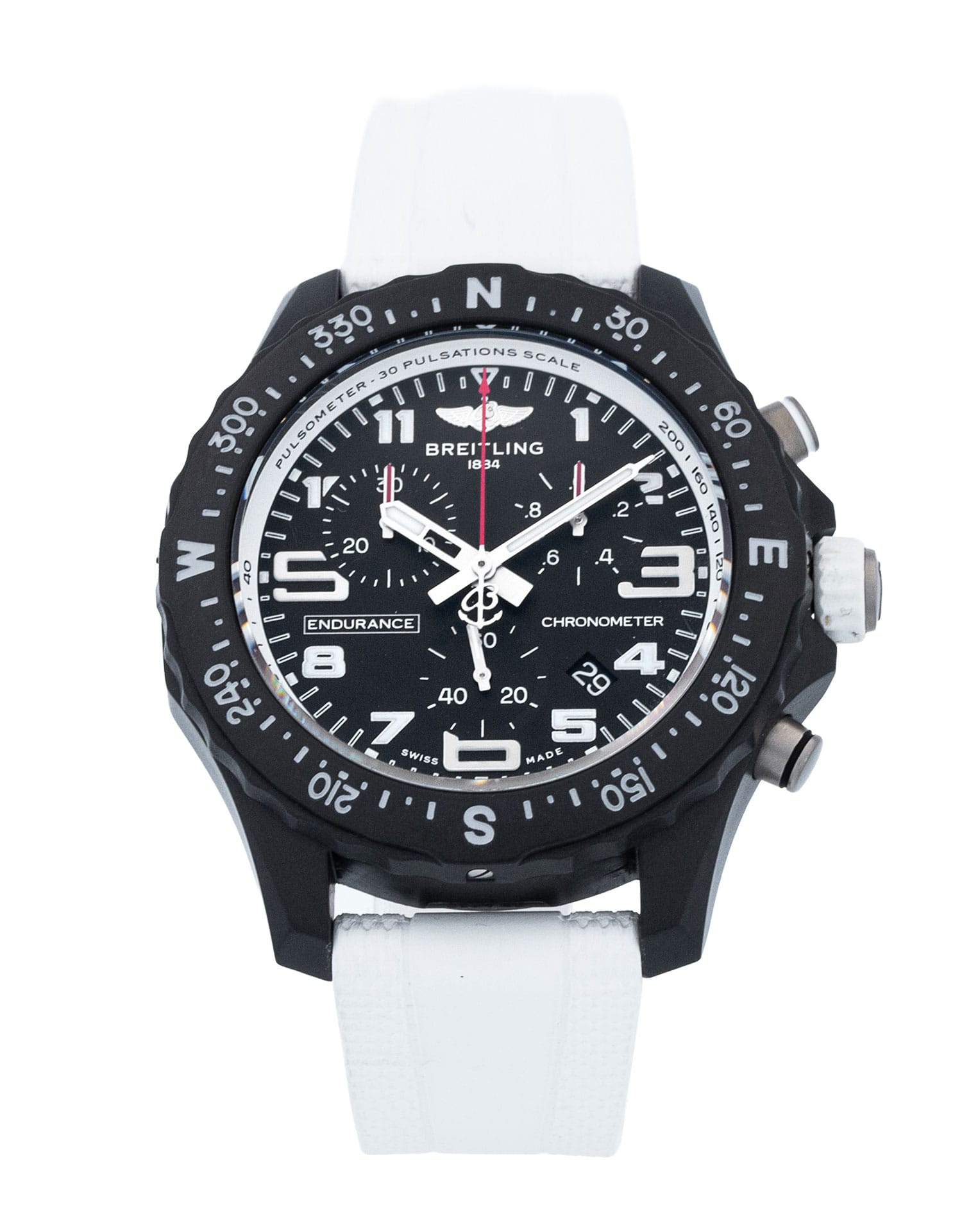 This Breitling Endurance Pro X83310 has a black arabic dial and a rubber strap. This Breitling has undergone a thorough inspection of water resistance, accuracy, functionality and condition to determine the level of reconditioning required to meet our strict standards. It has also been referenced against technical documents and manufacturer records where available to ensure authenticity and a clean history. All our watches have a 24-month warranty for your peace of mind.