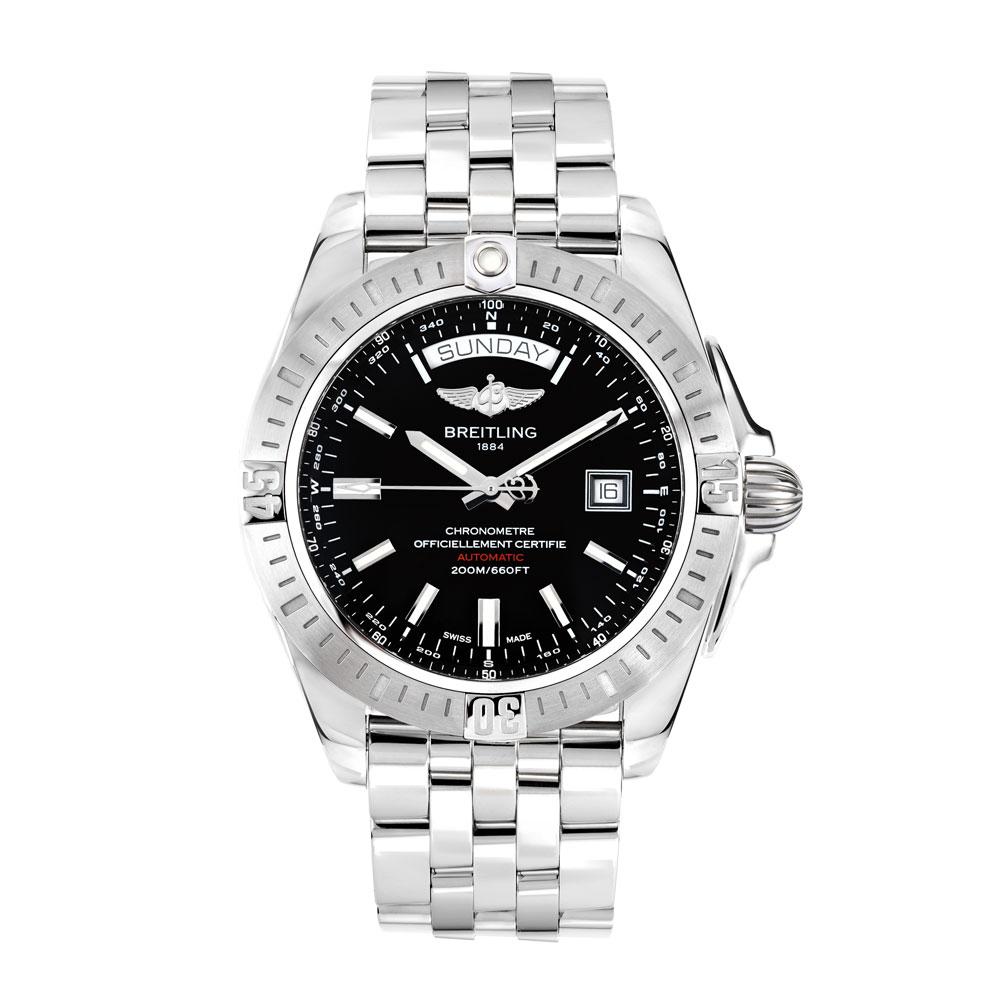This Breitling Galactic 44 A45320 has a black baton dial and a bracelet strap. This Breitling has undergone a thorough inspection of water resistance, accuracy, functionality and condition to determine the level of reconditioning required to meet our strict standards. It has also been referenced against technical documents and manufacturer records where available to ensure authenticity and a clean history. All our watches have a 24-month warranty for your peace of mind.