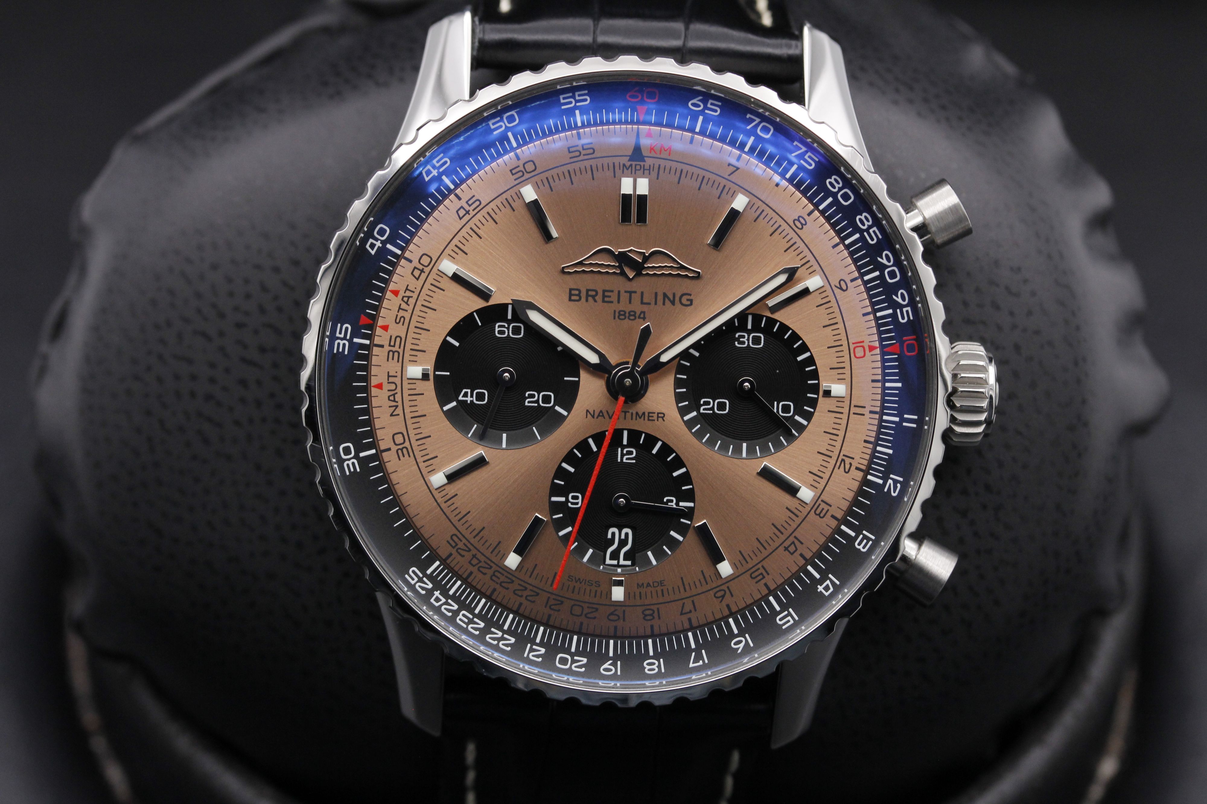 This Breitling Navitimer B01 Chronograph 43 AB0138 has a copper baton dial and a leather strap. This Breitling has undergone a thorough inspection of water resistance, accuracy, functionality and condition to determine the level of reconditioning required to meet our strict standards. It has also been referenced against technical documents and manufacturer records where available to ensure authenticity and a clean history. All our watches have a 24-month warranty for your peace of mind.