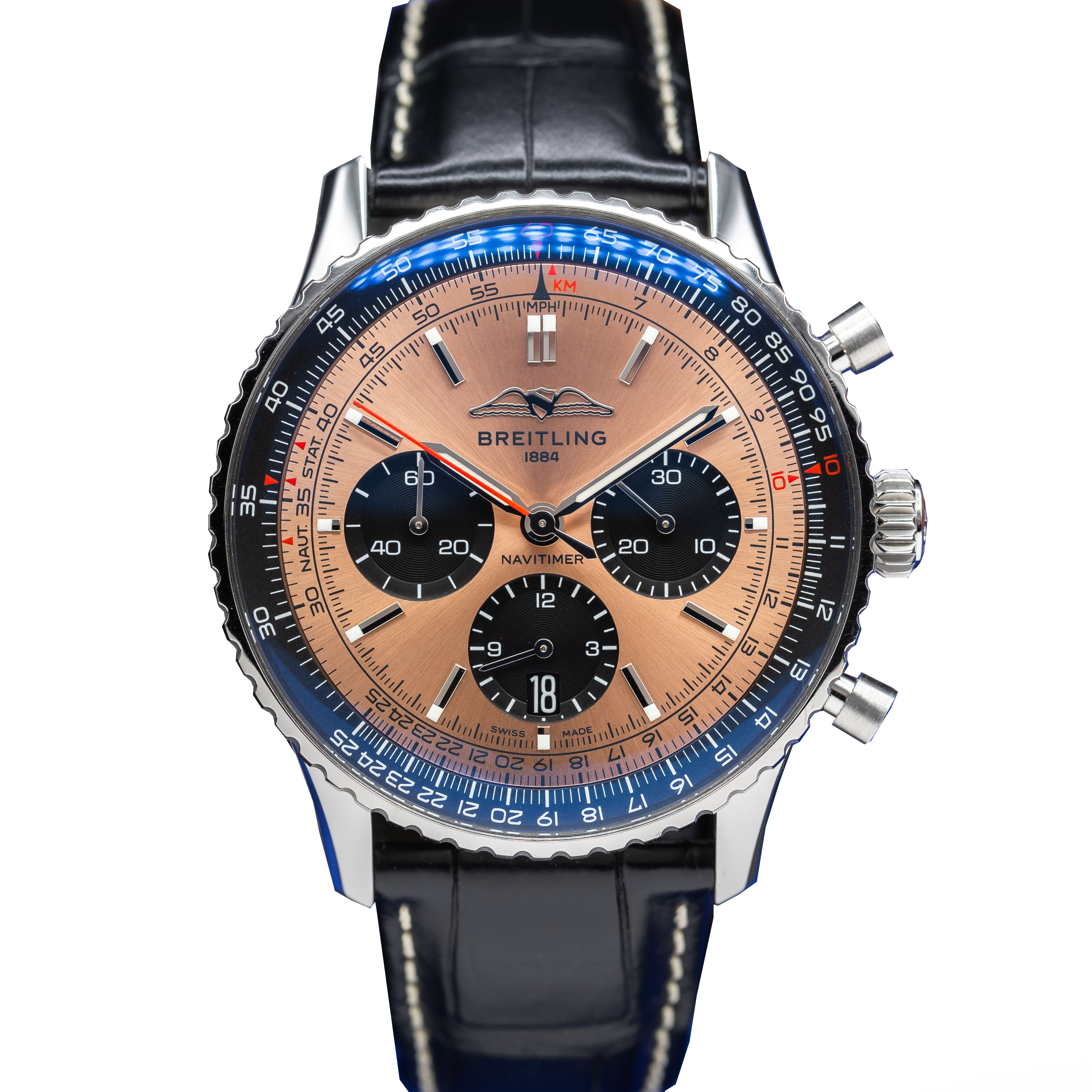 This Breitling Navitimer B01 Chronograph 43 AB0138 has a copper baton dial and a leather strap. This Breitling has undergone a thorough inspection of water resistance, accuracy, functionality and condition to determine the level of reconditioning required to meet our strict standards. It has also been referenced against technical documents and manufacturer records where available to ensure authenticity and a clean history. Our watches have a 24-month warranty for your peace of mind, in conjunction with any remaining manufacturer’s warranty from new or from service.