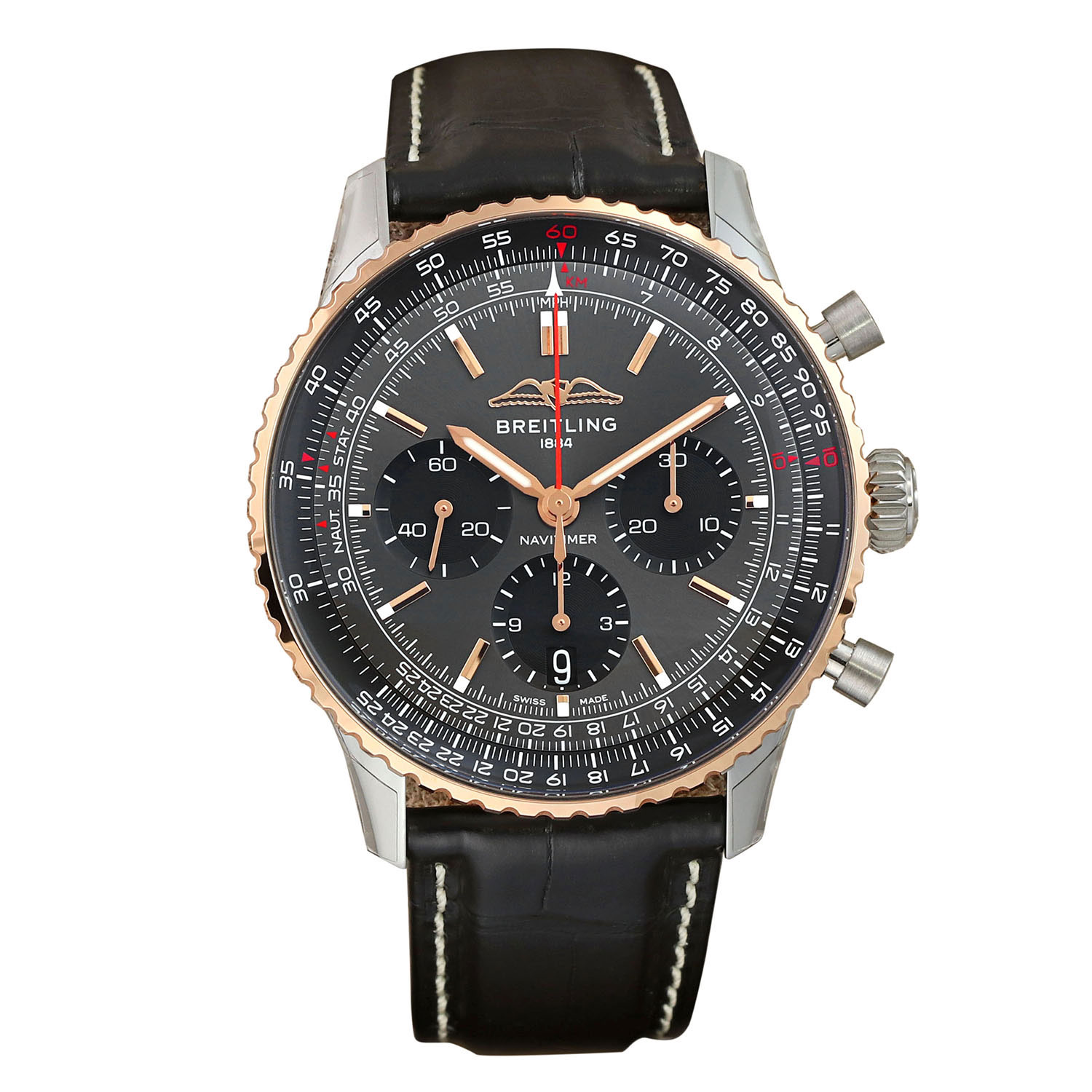 This Breitling Navitimer B01 Chronograph 43 UB0138 has a grey baton dial and a leather strap. This Breitling has undergone a thorough inspection of water resistance, accuracy, functionality and condition to determine the level of reconditioning required to meet our strict standards. It has also been referenced against technical documents and manufacturer records where available to ensure authenticity and a clean history. Our watches have a 24-month warranty for your peace of mind, in conjunction with any remaining manufacturer’s warranty from new or from service.