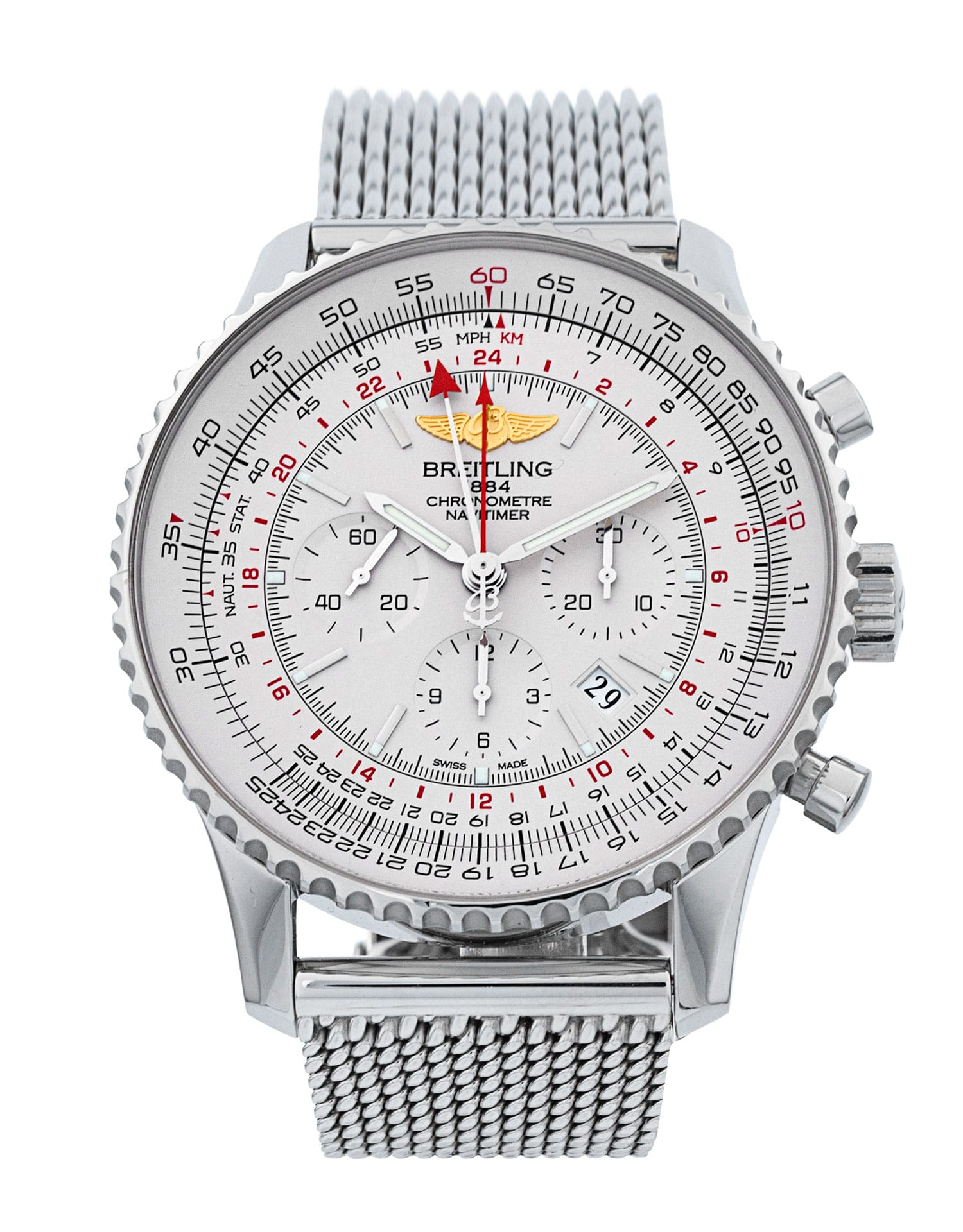 This Breitling Navitimer GMT AB0441 has a silver baton dial and a bracelet strap. This Breitling has undergone a thorough inspection of water resistance, accuracy, functionality and condition to determine the level of reconditioning required to meet our strict standards. It has also been referenced against technical documents and manufacturer records where available to ensure authenticity and a clean history. All our watches have a 24-month warranty for your peace of mind.