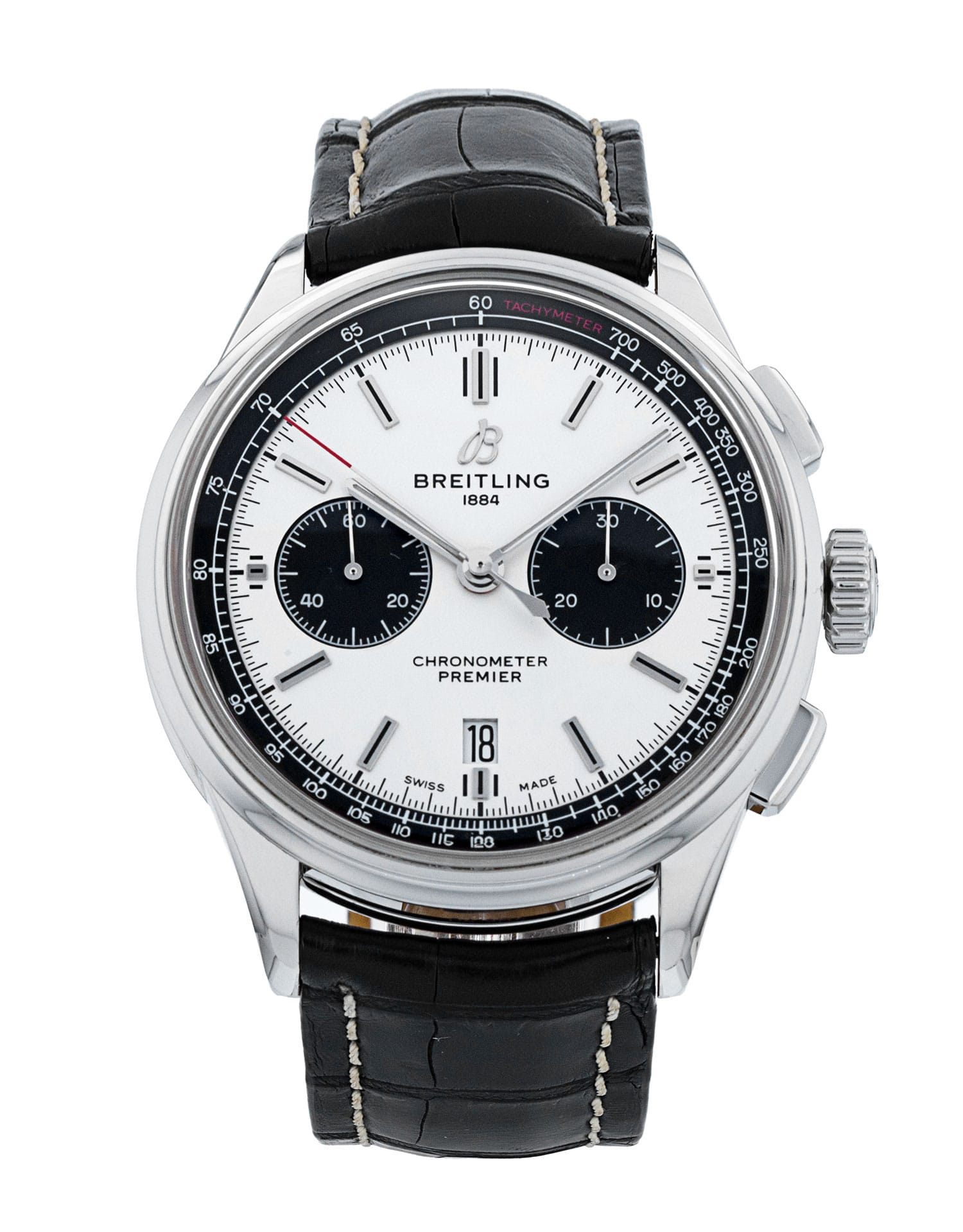 This Breitling Premier B01 AB0118 has a white baton dial and a leather strap. This Breitling has undergone a thorough inspection of water resistance, accuracy, functionality and condition to determine the level of reconditioning required to meet our strict standards. It has also been referenced against technical documents and manufacturer records where available to ensure authenticity and a clean history. All our watches have a 24-month warranty for your peace of mind.