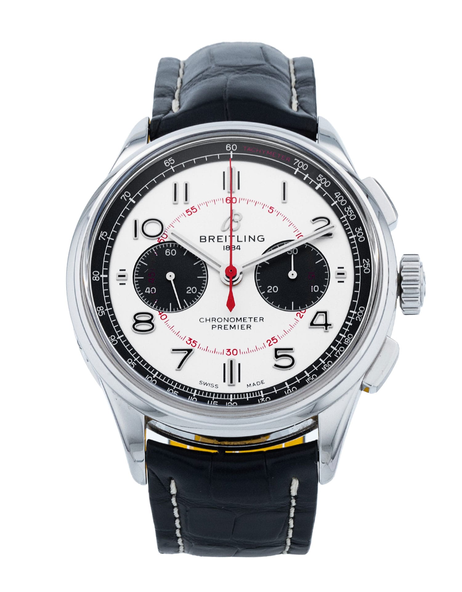 This Breitling Premier B01 AB0118 has a white arabic dial and a leather strap. This Breitling has undergone a thorough inspection of water resistance, accuracy, functionality and condition to determine the level of reconditioning required to meet our strict standards. It has also been referenced against technical documents and manufacturer records where available to ensure authenticity and a clean history. Our watches have a 24-month warranty for your peace of mind, in conjunction with any remaining manufacturer’s warranty from new or from service.