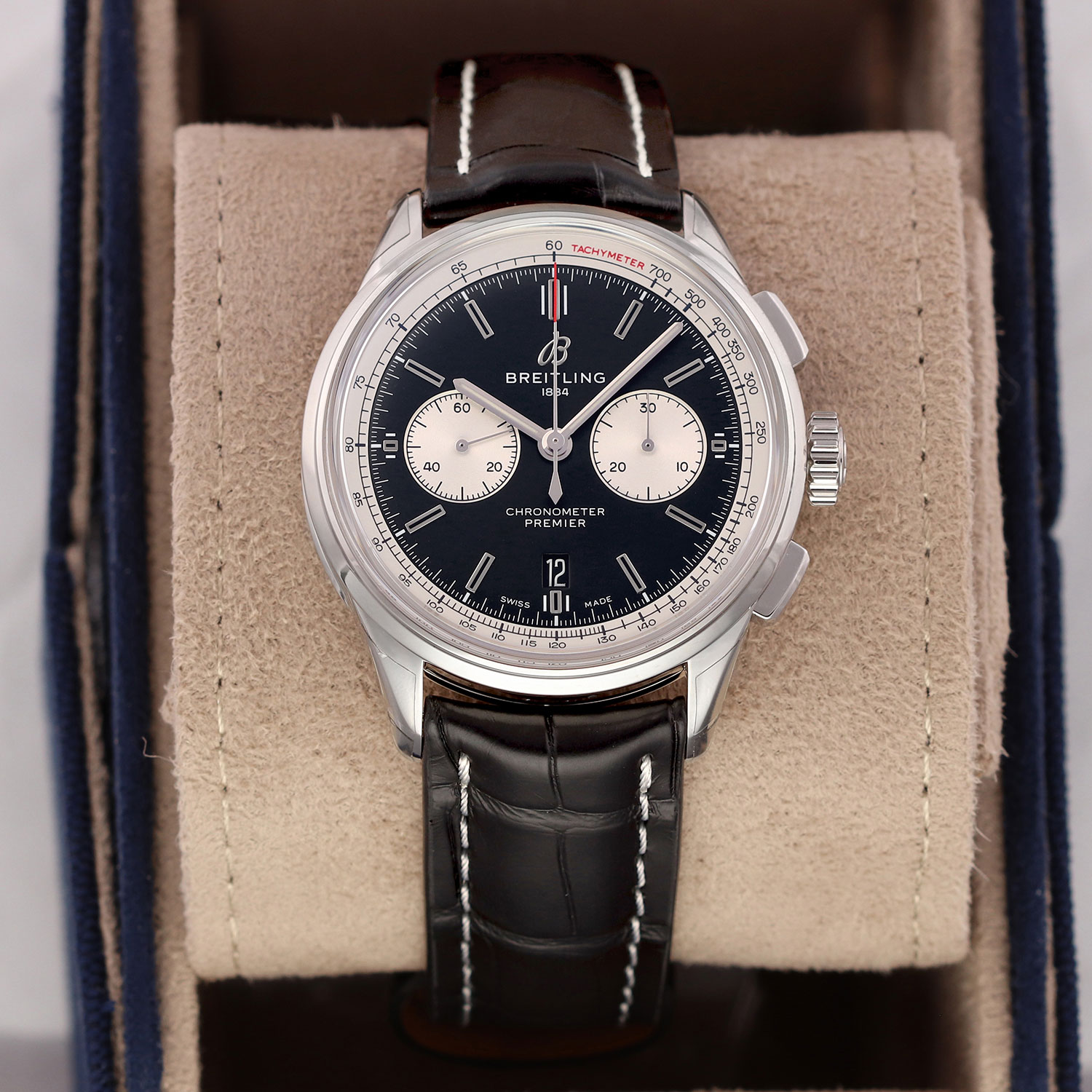This Breitling Premier B01 AB0118 has a blue baton dial and a leather strap. This Breitling has undergone a thorough inspection of water resistance, accuracy, functionality and condition to determine the level of reconditioning required to meet our strict standards. It has also been referenced against technical documents and manufacturer records where available to ensure authenticity and a clean history. Our watches have a 24-month warranty for your peace of mind, in conjunction with any remaining manufacturer’s warranty from new or from service.