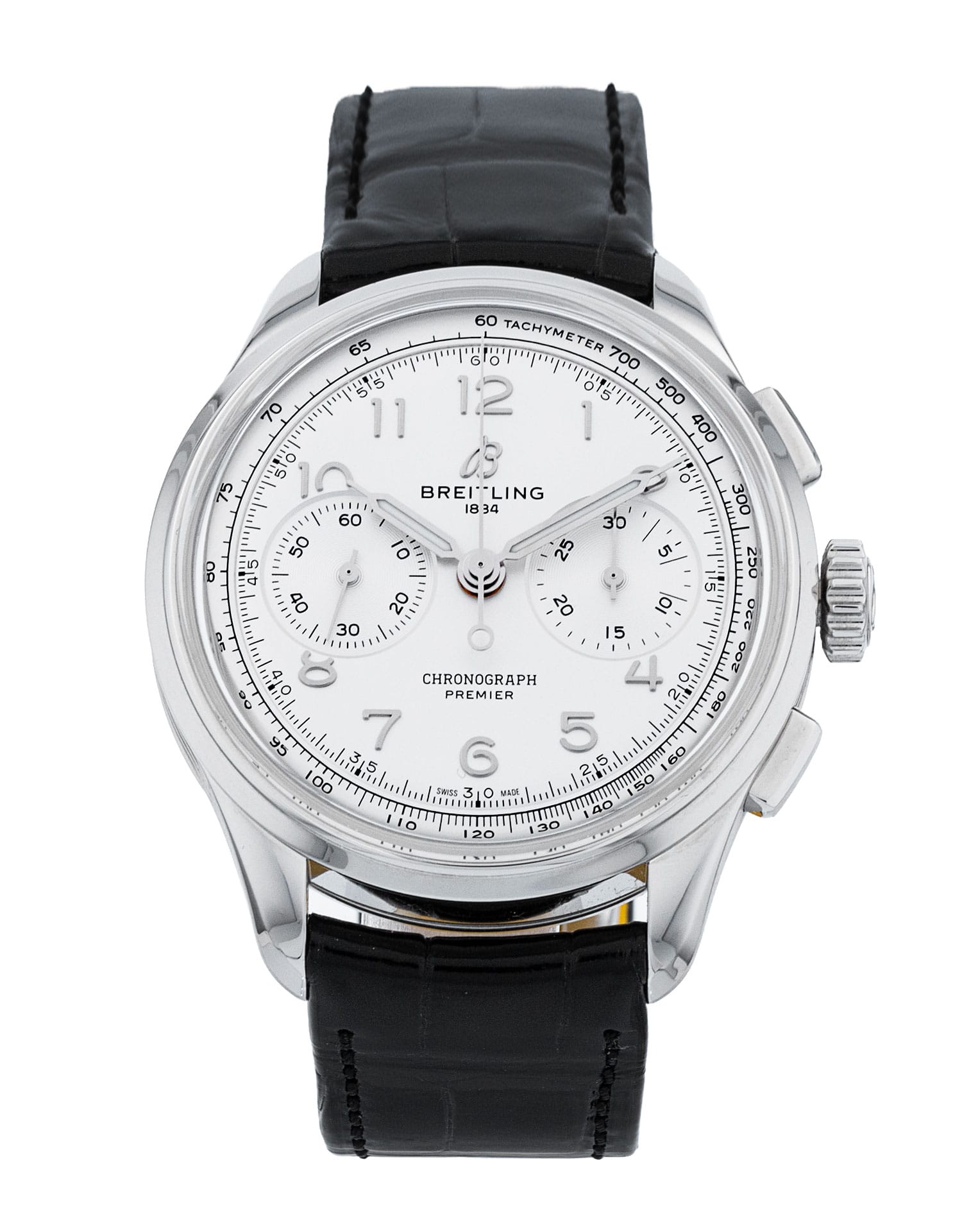 This Breitling Premier AB0930 has a silver arabic dial and a leather strap. This Breitling has undergone a thorough inspection of water resistance, accuracy, functionality and condition to determine the level of reconditioning required to meet our strict standards. It has also been referenced against technical documents and manufacturer records where available to ensure authenticity and a clean history. All our watches have a 24-month warranty for your peace of mind.