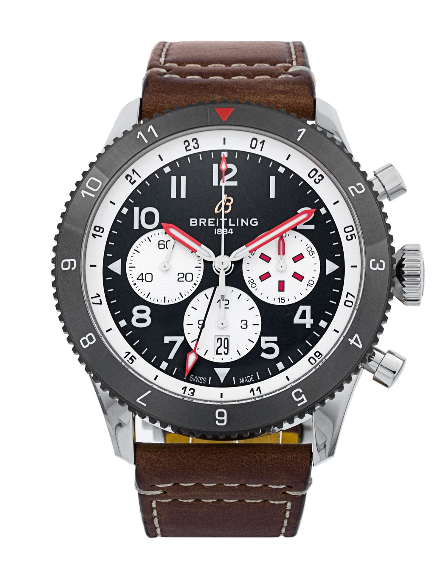 This Breitling Super AVI YB0445 has a black arabic dial and a leather strap. This Breitling has undergone a thorough inspection of water resistance, accuracy, functionality and condition to determine the level of reconditioning required to meet our strict standards. It has also been referenced against technical documents and manufacturer records where available to ensure authenticity and a clean history. Our watches have a 24-month warranty for your peace of mind, in conjunction with any remaining manufacturer’s warranty from new or from service.
