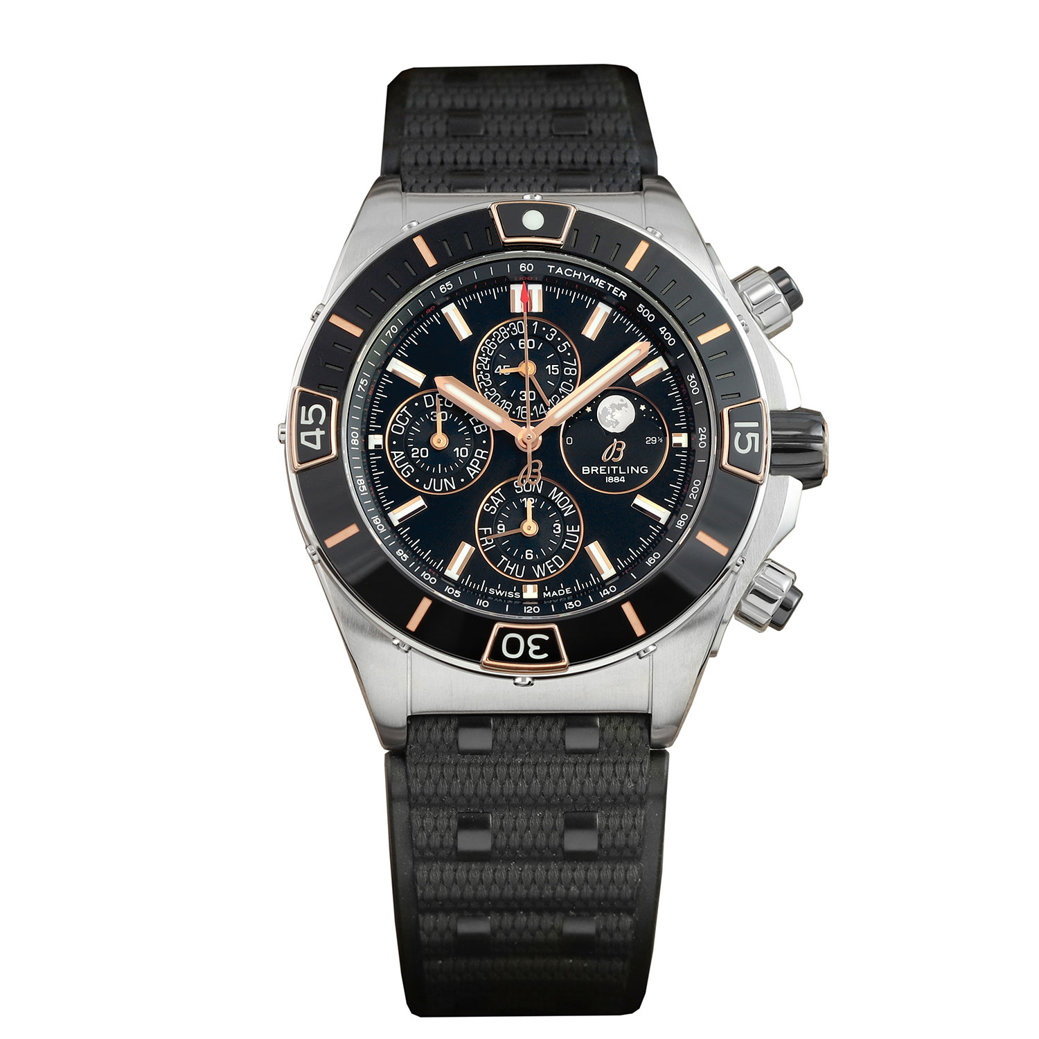 This Breitling Super Chronomat 44 Four-Year Calendar I19320 has a black dial and a rubber strap. This Breitling has undergone a thorough inspection of water resistance, accuracy, functionality and condition to determine the level of reconditioning required to meet our strict standards. It has also been referenced against technical documents and manufacturer records where available to ensure authenticity and a clean history. Our watches have a 24-month warranty for your peace of mind, in conjunction with any remaining manufacturer’s warranty from new or from service.
