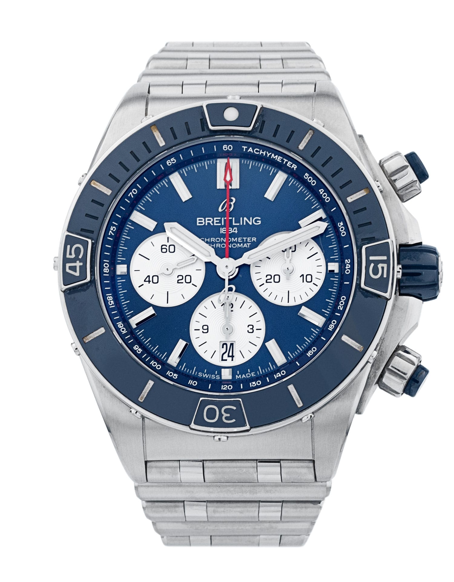 This Breitling Super Chronomat B01 44 AB0136 has a blue dial and a bracelet strap. This Breitling has undergone a thorough inspection of water resistance, accuracy, functionality and condition to determine the level of reconditioning required to meet our strict standards. It has also been referenced against technical documents and manufacturer records where available to ensure authenticity and a clean history. Our watches have a 24-month warranty for your peace of mind, in conjunction with any remaining manufacturer’s warranty from new or from service.