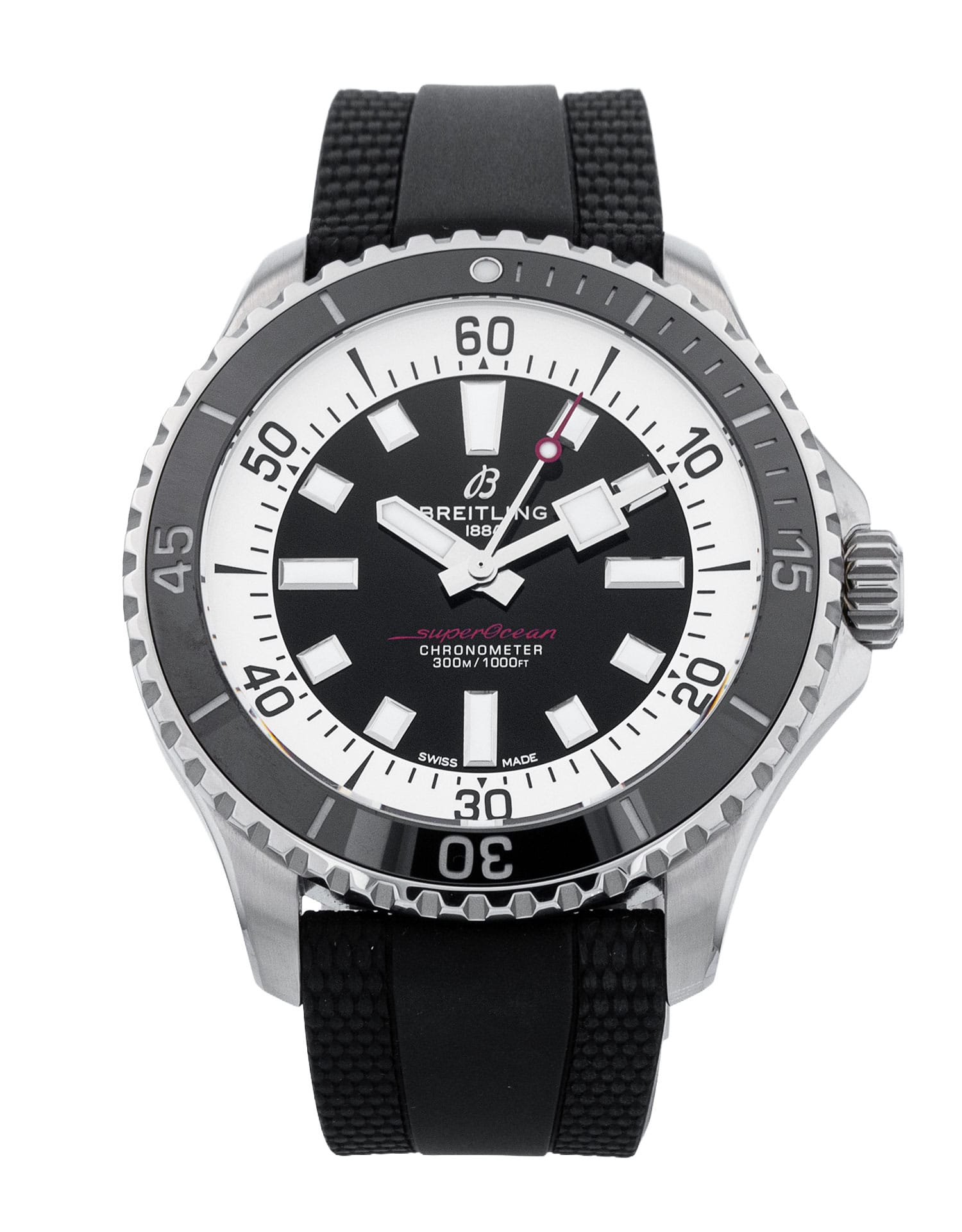 This Breitling SuperOcean Automatic 44 A17376 has a black dial and a rubber strap. This Breitling has undergone a thorough inspection of water resistance, accuracy, functionality and condition to determine the level of reconditioning required to meet our strict standards. It has also been referenced against technical documents and manufacturer records where available to ensure authenticity and a clean history. Our watches have a 24-month warranty for your peace of mind, in conjunction with any remaining manufacturer’s warranty from new or from service.