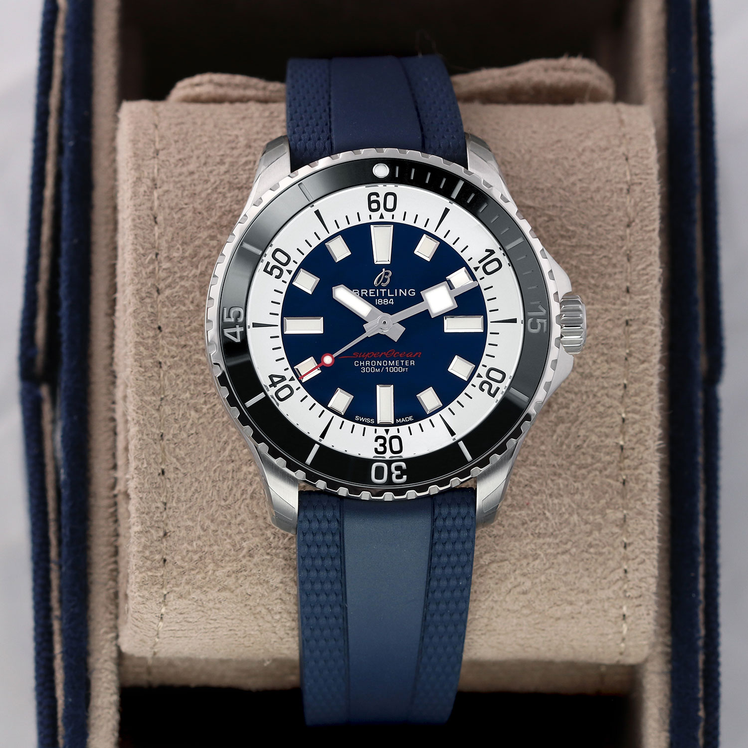 This Breitling SuperOcean Automatic 44 A17376 has a blue dial and a rubber strap. This Breitling has undergone a thorough inspection of water resistance, accuracy, functionality and condition to determine the level of reconditioning required to meet our strict standards. It has also been referenced against technical documents and manufacturer records where available to ensure authenticity and a clean history. All our watches have a 24-month warranty for your peace of mind.