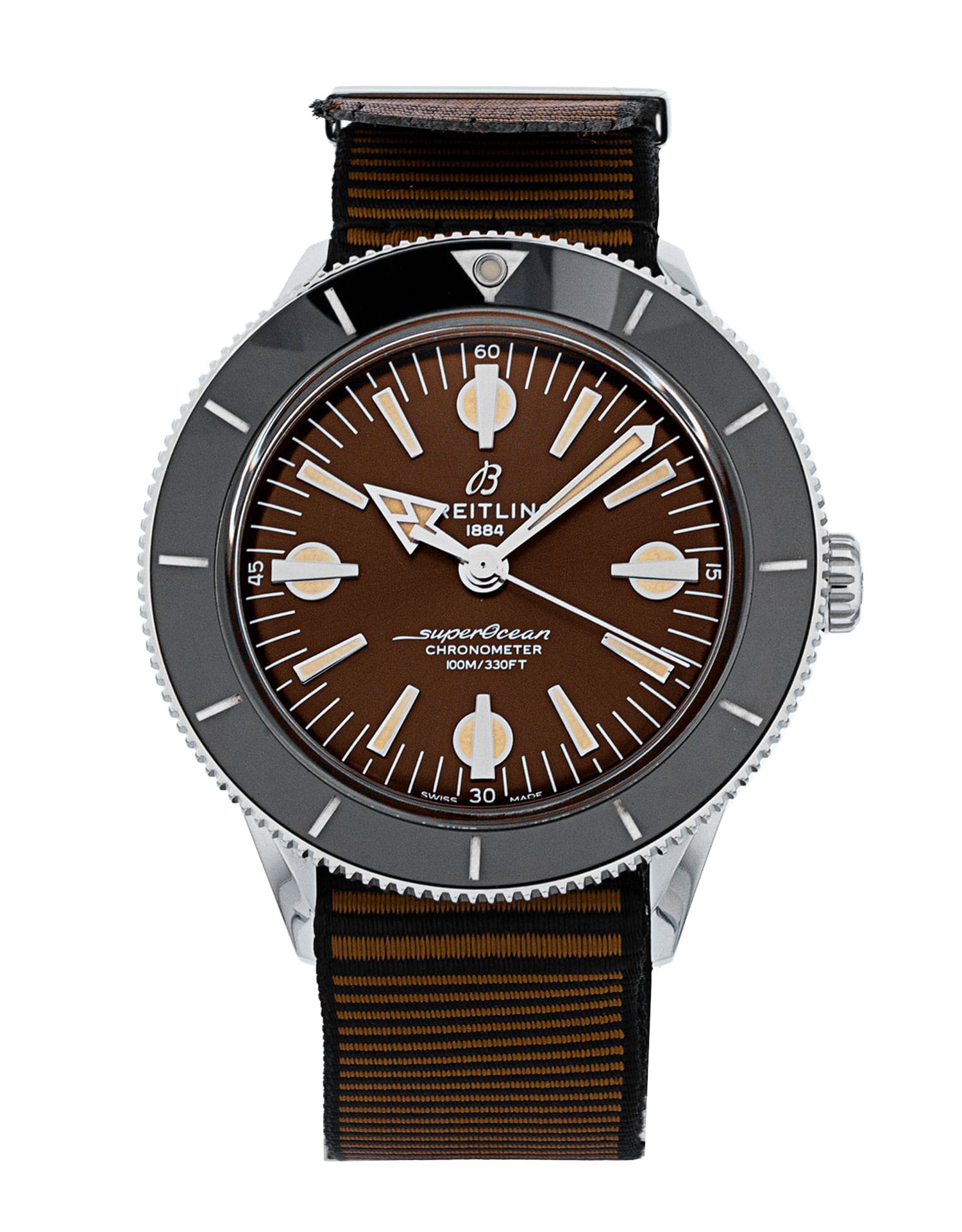 This Breitling SuperOcean Heritage 57 A10370 has a bronze baton dial and a fabric strap. This Breitling has undergone a thorough inspection of water resistance, accuracy, functionality and condition to determine the level of reconditioning required to meet our strict standards. It has also been referenced against technical documents and manufacturer records where available to ensure authenticity and a clean history. All our watches have a 24-month warranty for your peace of mind.