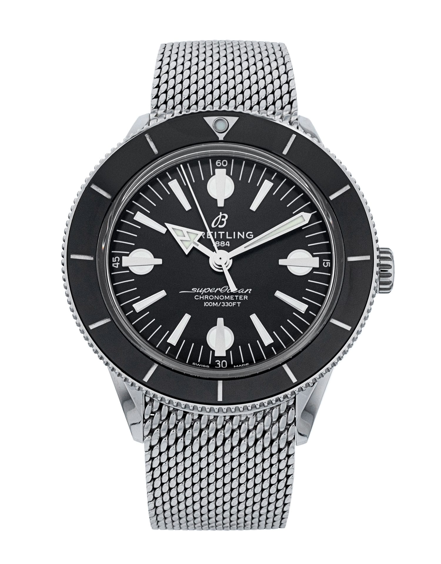 This Breitling SuperOcean Heritage 57 A10370 has a black dial and a bracelet strap. This Breitling has undergone a thorough inspection of water resistance, accuracy, functionality and condition to determine the level of reconditioning required to meet our strict standards. It has also been referenced against technical documents and manufacturer records where available to ensure authenticity and a clean history. All our watches have a 24-month warranty for your peace of mind.