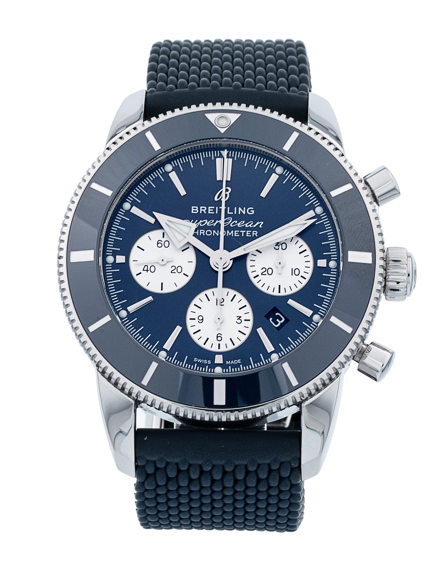 This Breitling SuperOcean Heritage B01 Chronograph 44 AB0162 has a blue baton dial and a rubber strap. This Breitling has undergone a thorough inspection of water resistance, accuracy, functionality and condition to determine the level of reconditioning required to meet our strict standards. It has also been referenced against technical documents and manufacturer records where available to ensure authenticity and a clean history. Our watches have a 24-month warranty for your peace of mind, in conjunction with any remaining manufacturer’s warranty from new or from service.