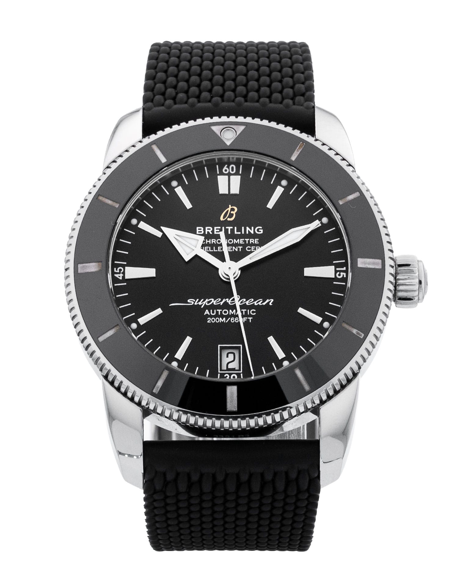 This Breitling SuperOcean Heritage B20 Automatic 42 AB2010 has a black baton dial and a rubber strap. This Breitling has undergone a thorough inspection of water resistance, accuracy, functionality and condition to determine the level of reconditioning required to meet our strict standards. It has also been referenced against technical documents and manufacturer records where available to ensure authenticity and a clean history. Our watches have a 24-month warranty for your peace of mind, in conjunction with any remaining manufacturer’s warranty from new or from service.