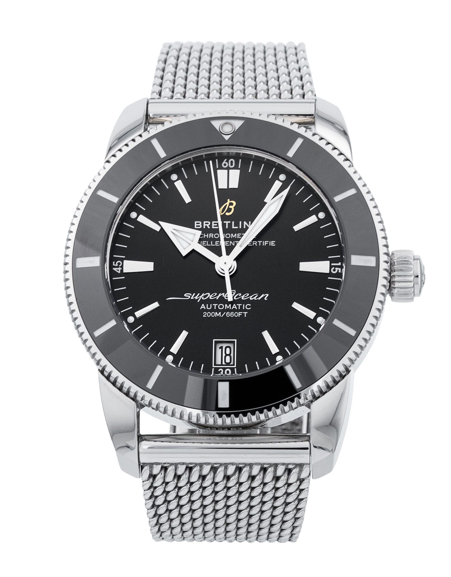This Breitling SuperOcean Heritage B20 Automatic 42 AB2010 has a black baton dial and a bracelet strap. This Breitling has undergone a thorough inspection of water resistance, accuracy, functionality and condition to determine the level of reconditioning required to meet our strict standards. It has also been referenced against technical documents and manufacturer records where available to ensure authenticity and a clean history. Our watches have a 24-month warranty for your peace of mind, in conjunction with any remaining manufacturer’s warranty from new or from service.