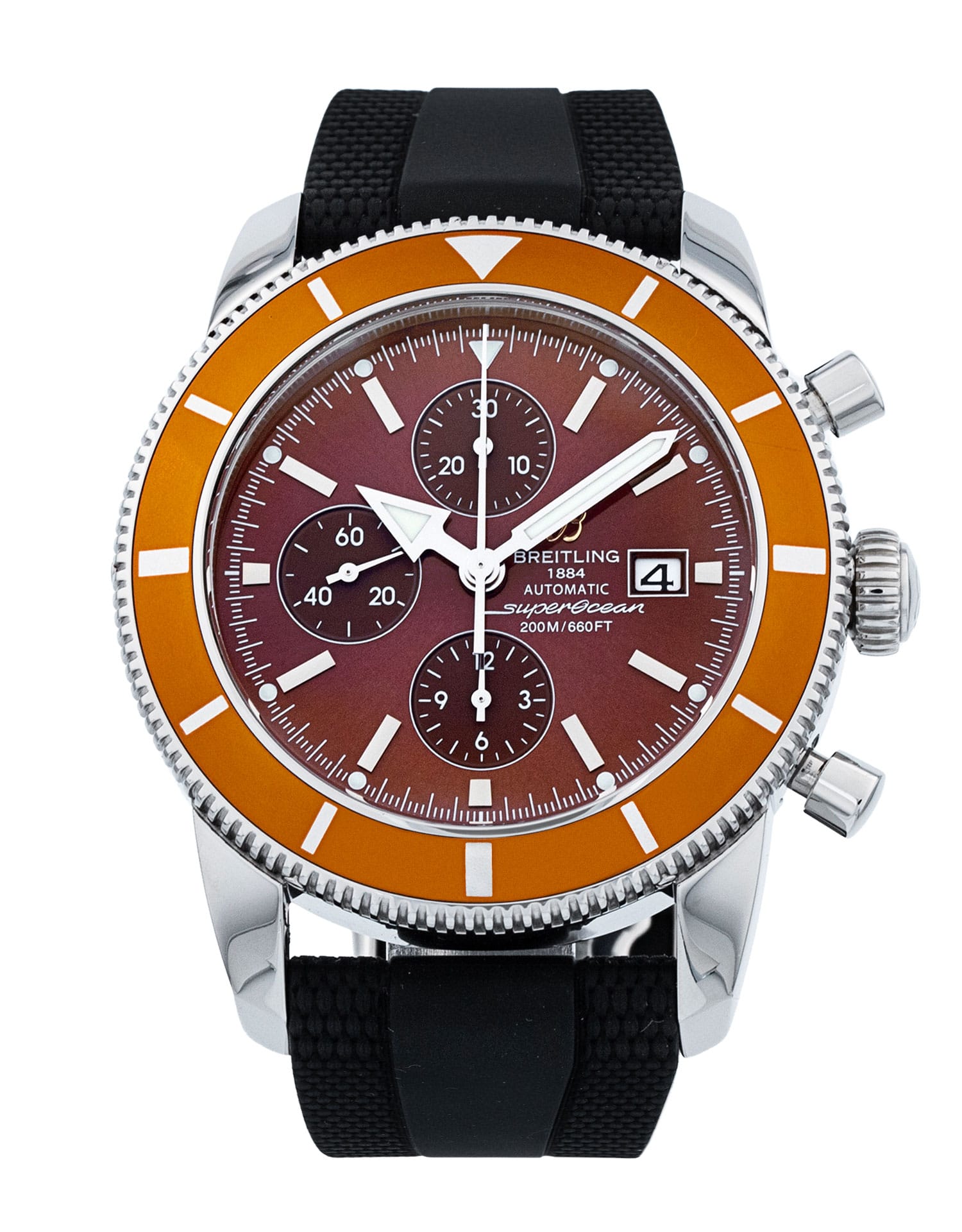 This Breitling SuperOcean Heritage A13320 has a bronze baton dial and a rubber strap. This Breitling has undergone a thorough inspection of water resistance, accuracy, functionality and condition to determine the level of reconditioning required to meet our strict standards. It has also been referenced against technical documents and manufacturer records where available to ensure authenticity and a clean history. All our watches have a 24-month warranty for your peace of mind.