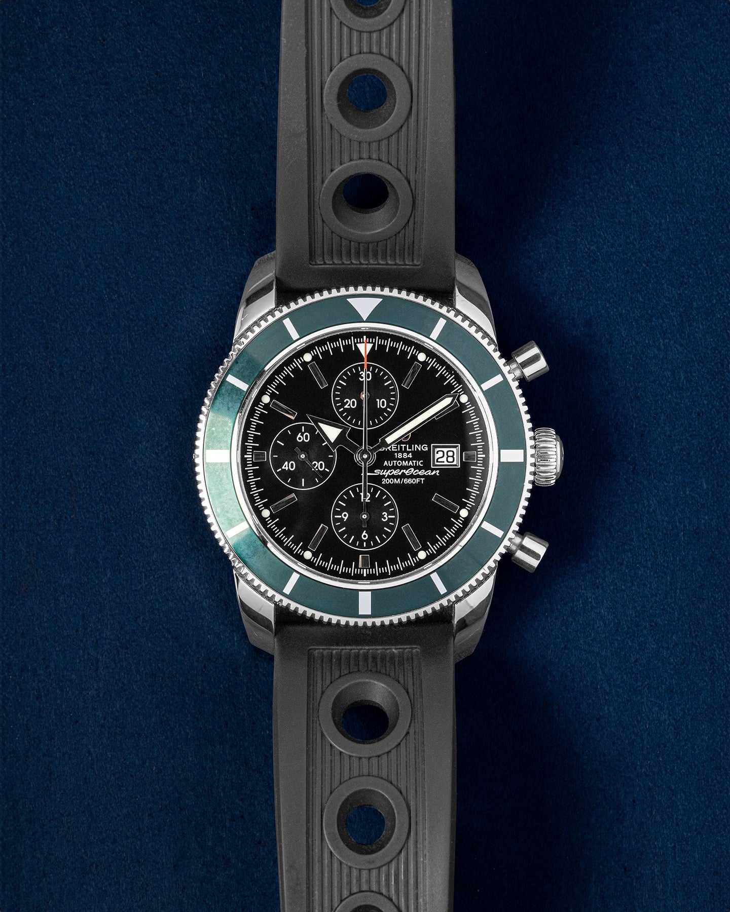 This Breitling SuperOcean Heritage A13320 has a black dial and a rubber strap. This Breitling has undergone a thorough inspection of water resistance, accuracy, functionality and condition to determine the level of reconditioning required to meet our strict standards. It has also been referenced against technical documents and manufacturer records where available to ensure authenticity and a clean history. All our watches have a 24-month warranty for your peace of mind.