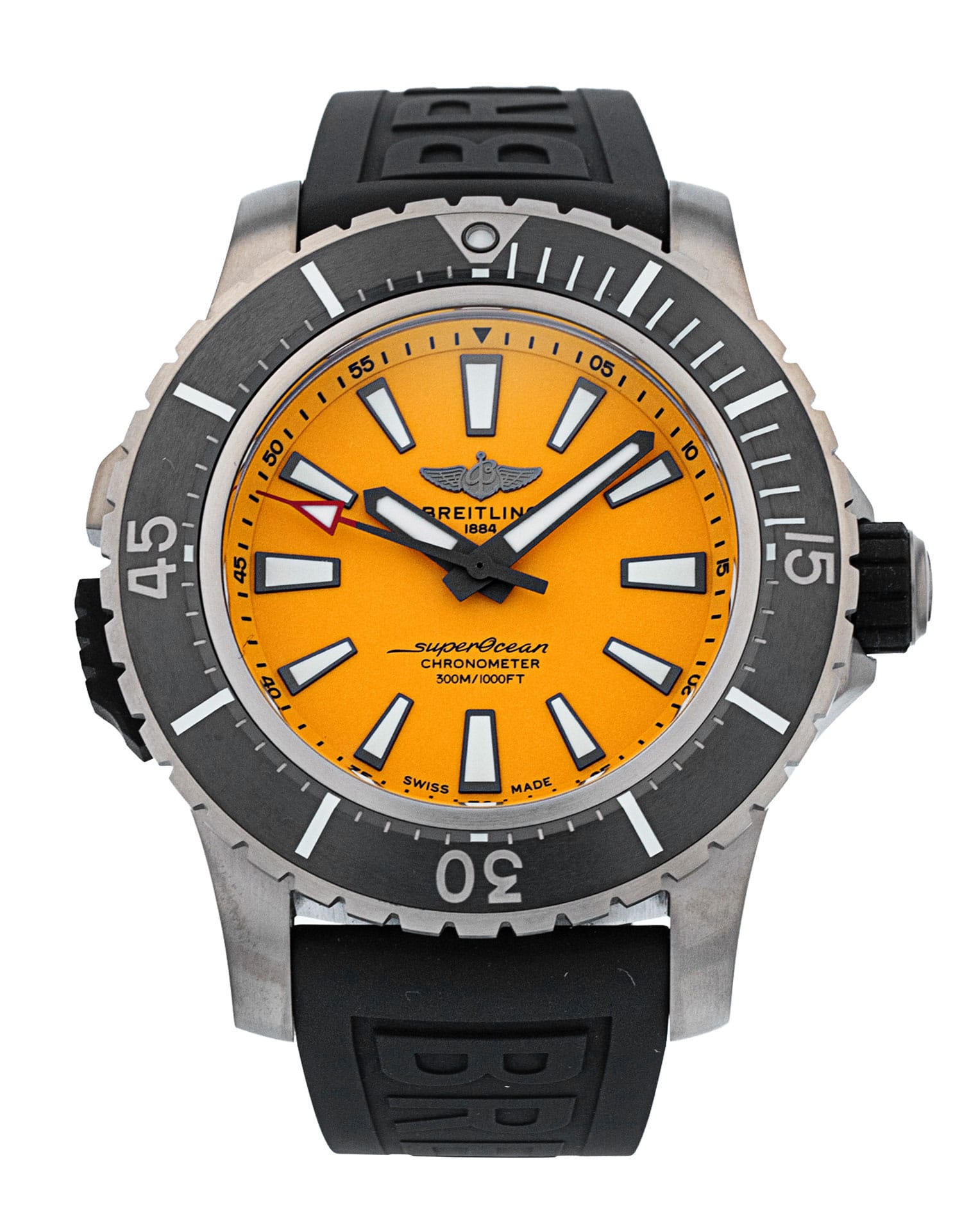 This Breitling SuperOcean E17369 has a yellow baton dial and a rubber strap. This Breitling has undergone a thorough inspection of water resistance, accuracy, functionality and condition to determine the level of reconditioning required to meet our strict standards. It has also been referenced against technical documents and manufacturer records where available to ensure authenticity and a clean history. All our watches have a 24-month warranty for your peace of mind.