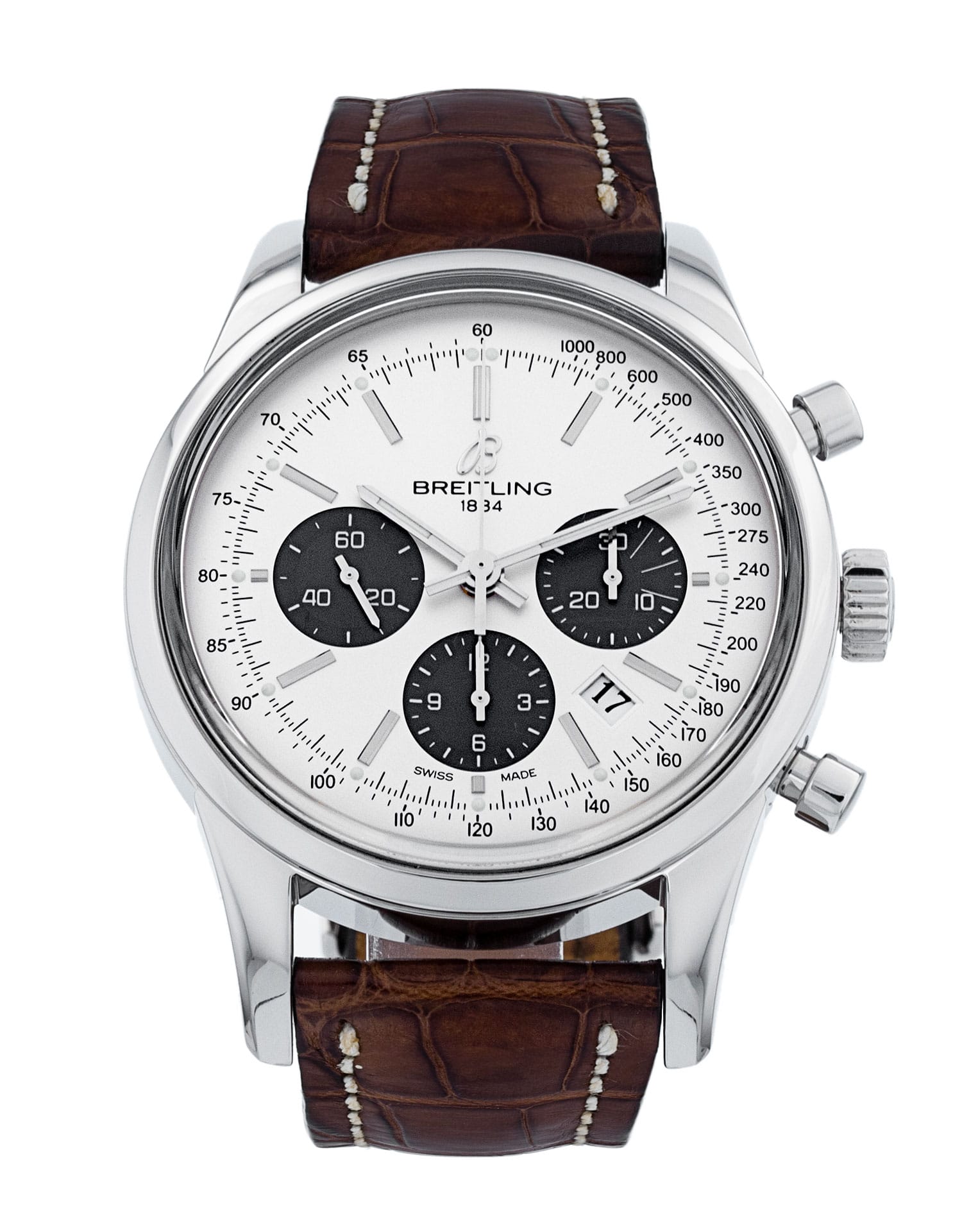 This Breitling Transocean Chronograph AB0152 has a silver baton dial and a leather strap. This Breitling has undergone a thorough inspection of accuracy, functionality and condition to determine the level of reconditioning required to meet our strict standards. It has also been referenced against technical documents and manufacturer records where available to ensure authenticity and a clean history. All our watches have a 24-month warranty for your peace of mind.
