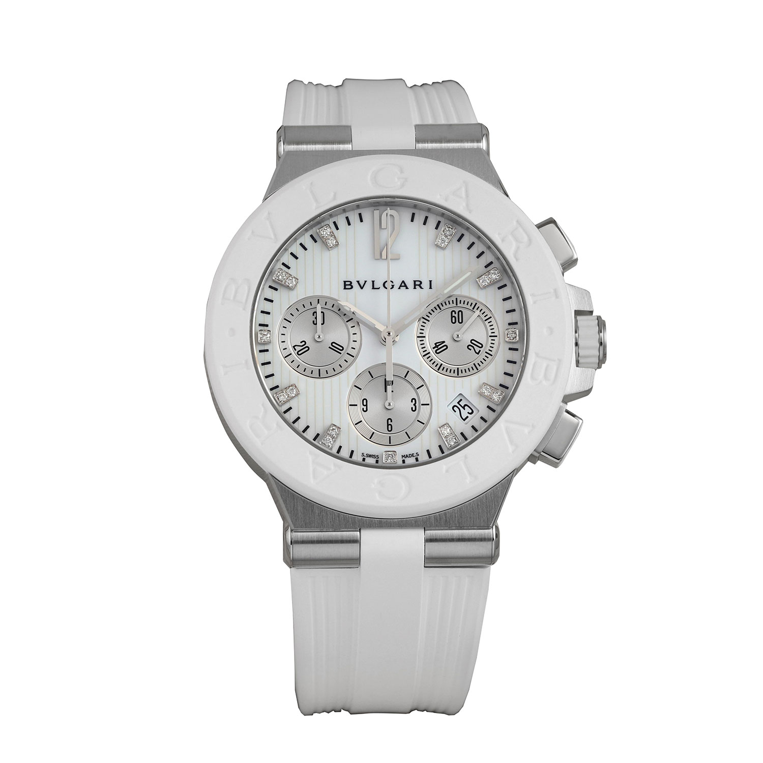 This Bvlgari Diagono 101801 has a mother of pearl white - diamond dial and a rubber strap. This Bvlgari has undergone a thorough inspection of water resistance, accuracy, functionality and condition to determine the level of reconditioning required to meet our strict standards. It has also been referenced against technical documents and manufacturer records where available to ensure authenticity and a clean history. All our watches have a 24-month warranty for your peace of mind.