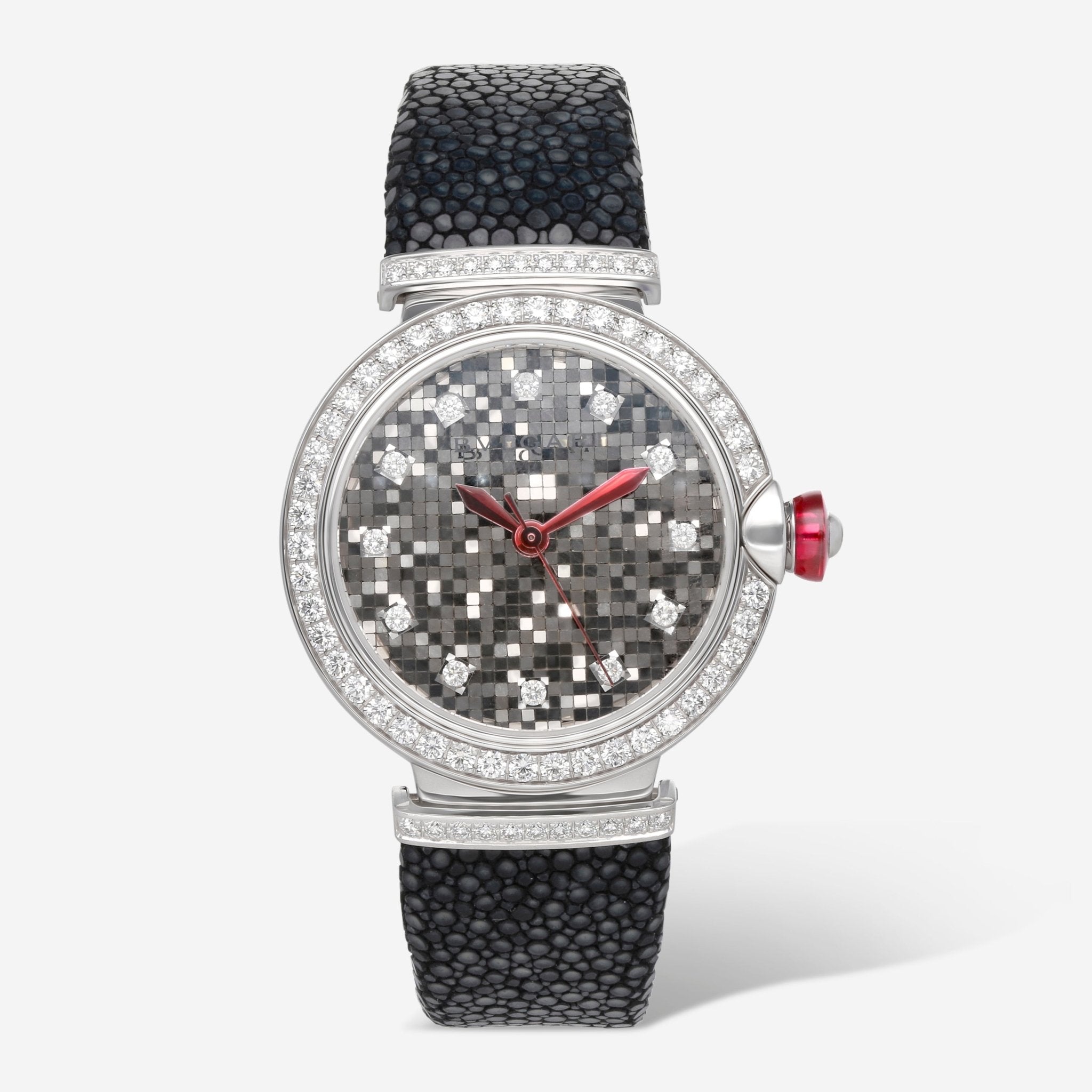 This Bvlgari Lvcea 102830 has a mosaic diamond dial and a leather strap. This Bvlgari has undergone a thorough inspection of water resistance, accuracy, functionality and condition to determine the level of reconditioning required to meet our strict standards. It has also been referenced against technical documents and manufacturer records where available to ensure authenticity and a clean history. All our watches have a 24-month warranty for your peace of mind.