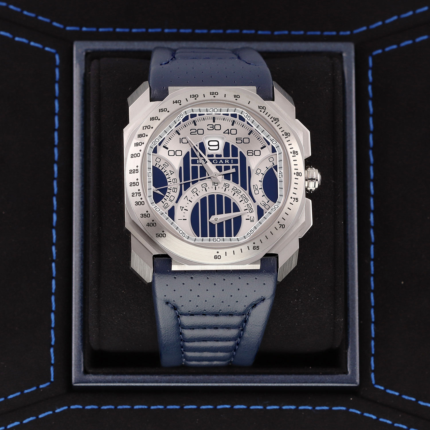 This Bvlgari Octo 101989 has a silver dial and a leather strap. This Bvlgari has undergone a thorough inspection of water resistance, accuracy, functionality and condition to determine the level of reconditioning required to meet our strict standards. It has also been referenced against technical documents and manufacturer records where available to ensure authenticity and a clean history. All our watches have a 24-month warranty for your peace of mind.