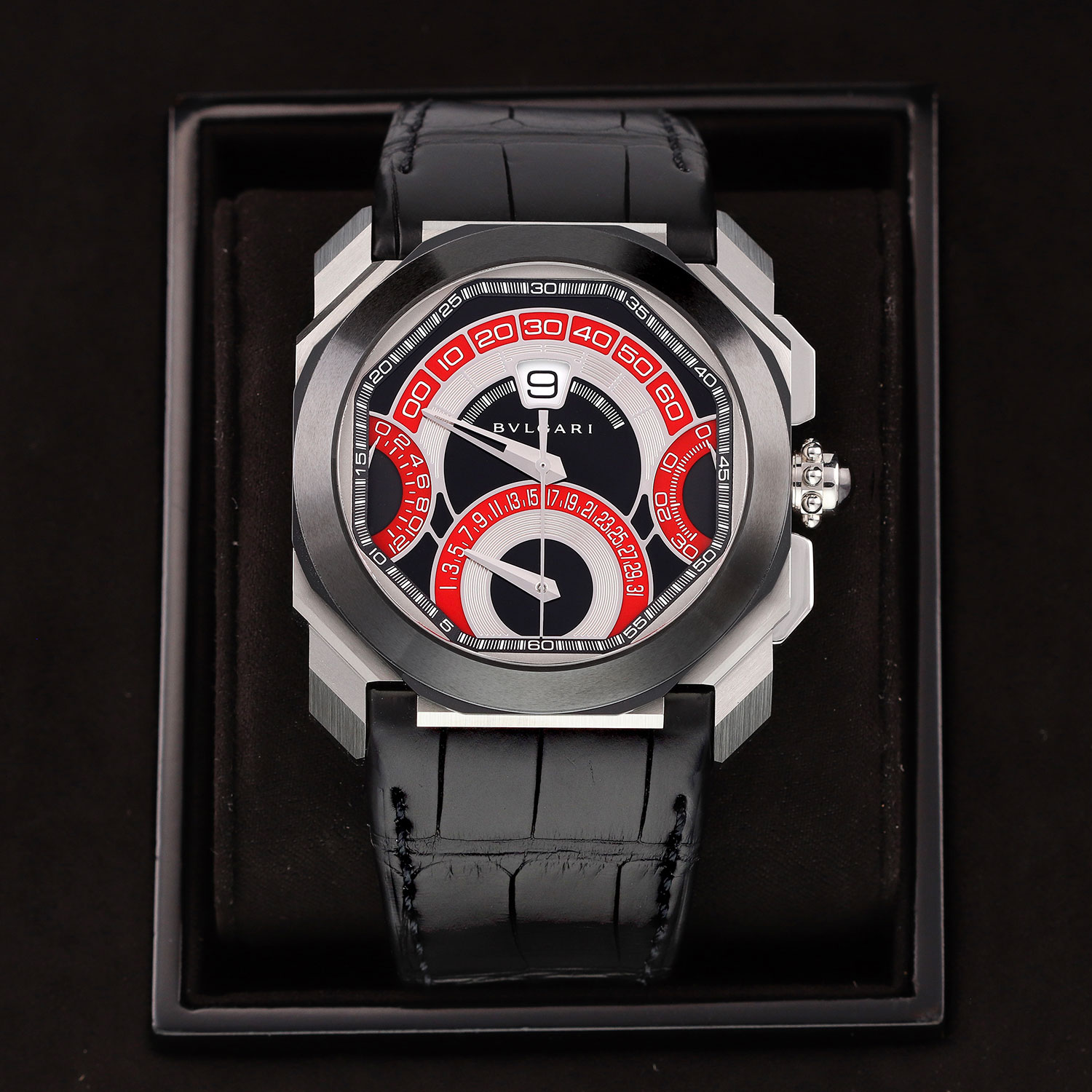 This Bvlgari Octo 102211 has a black dial and a leather strap. This Bvlgari has undergone a thorough inspection of water resistance, accuracy, functionality and condition to determine the level of reconditioning required to meet our strict standards. It has also been referenced against technical documents and manufacturer records where available to ensure authenticity and a clean history. All our watches have a 24-month warranty for your peace of mind.