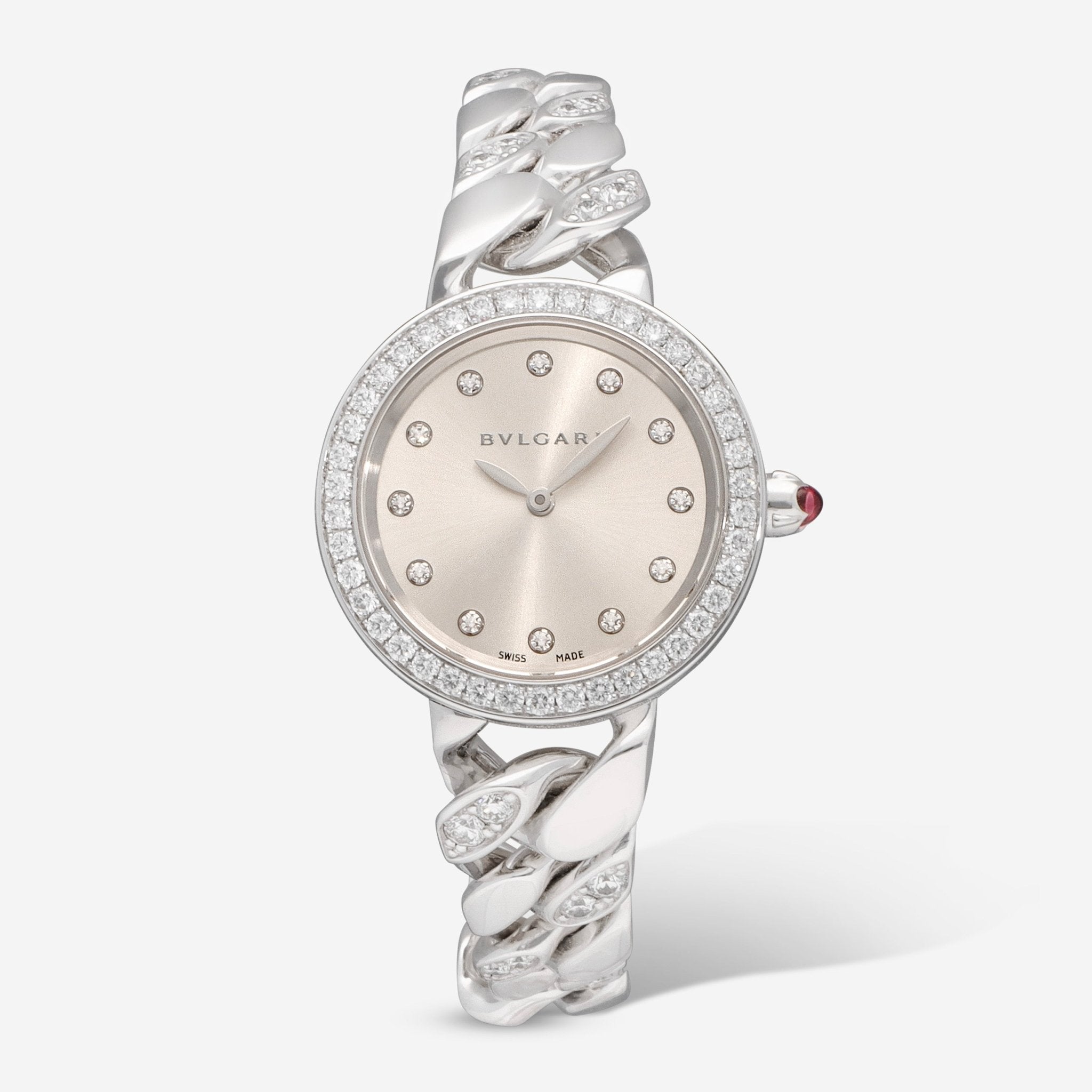 This Bvlgari Catene 102298 has a silver diamond dial and a bracelet strap. This Bvlgari has undergone a thorough inspection of water resistance, accuracy, functionality and condition to determine the level of reconditioning required to meet our strict standards. It has also been referenced against technical documents and manufacturer records where available to ensure authenticity and a clean history. All our watches have a 24-month warranty for your peace of mind.