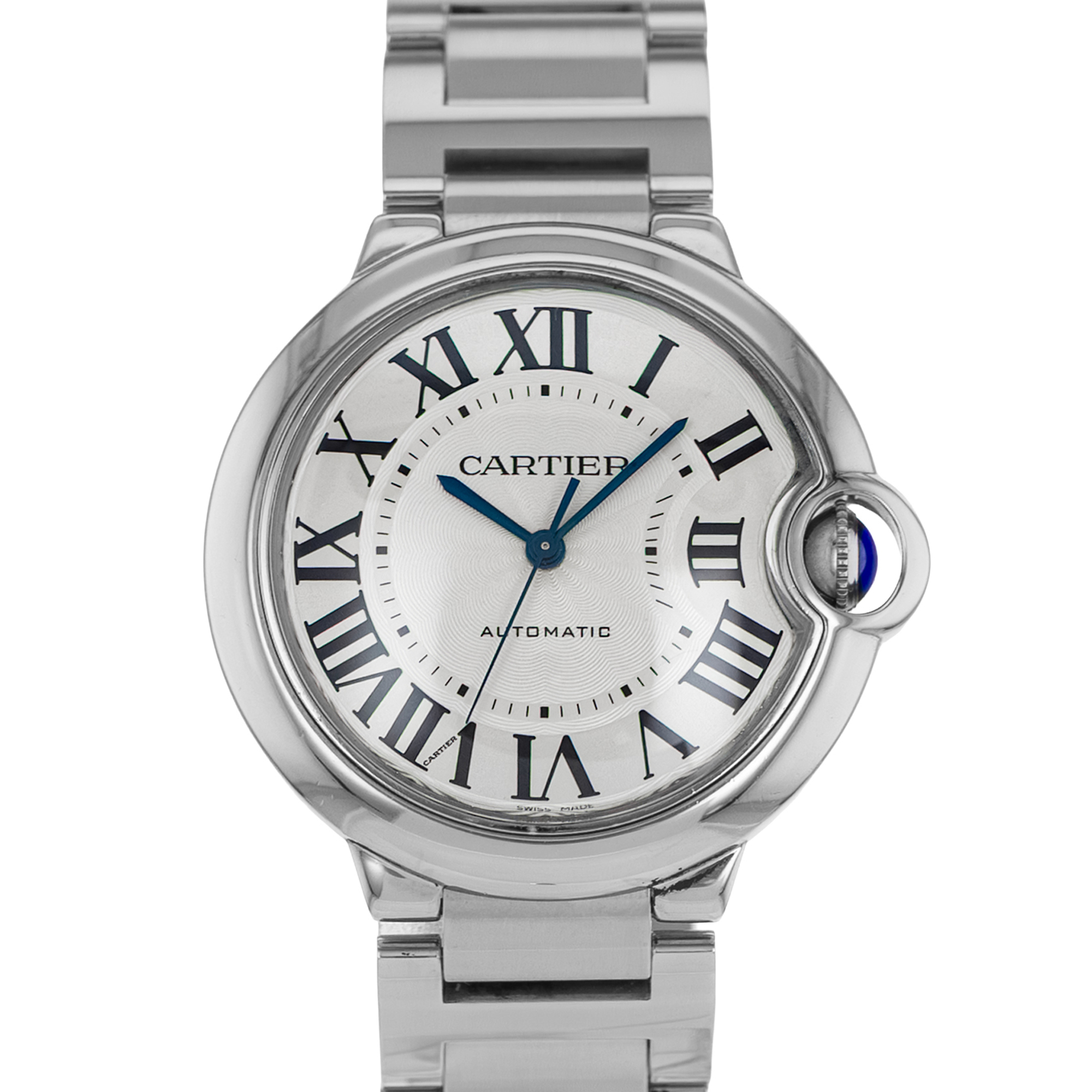 This Cartier Ballon Bleu W6920046 has a silver roman numeral dial and a bracelet strap. This Cartier has undergone a thorough inspection of accuracy, functionality and condition at our Cartier certified service centre to determine the level of reconditioning required to meet our strict standards. It has also been checked against our records to ensure authenticity. All our watches have a 24-month warranty for your peace of mind.