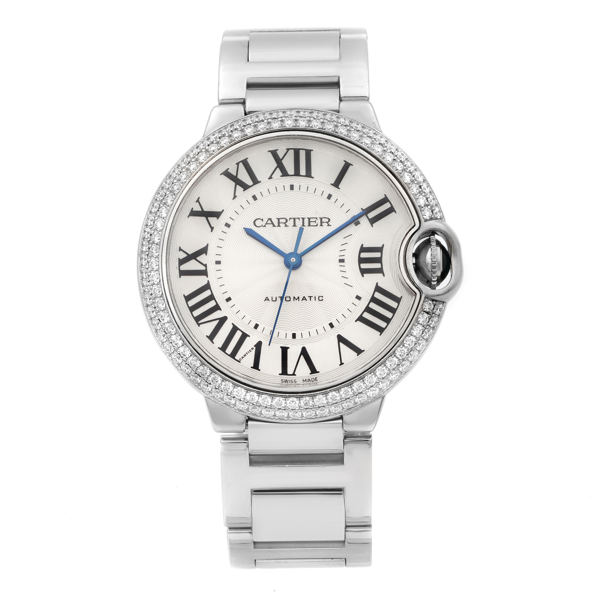 This Cartier Ballon Bleu WE9006Z3 has a silver roman numeral dial and a bracelet strap. This Cartier has undergone a thorough inspection of accuracy, functionality and condition at our Cartier certified service centre to determine the level of reconditioning required to meet our strict standards. It has also been checked against our records to ensure authenticity. All our watches have a 24-month warranty for your peace of mind.