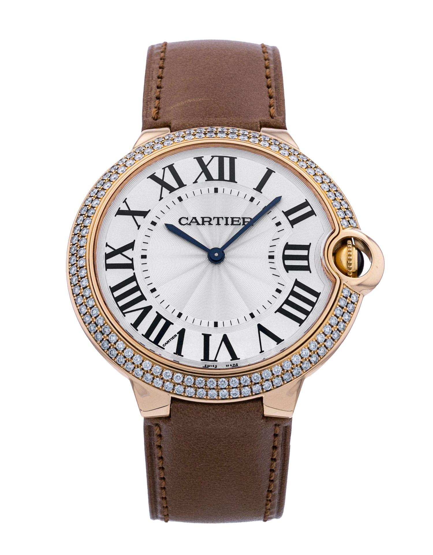This Cartier Ballon Bleu WE902055 has a silver roman numeral dial and a leather strap. This Cartier has undergone a thorough inspection of accuracy, functionality and condition at our Cartier certified service centre to determine the level of reconditioning required to meet our strict standards. It has also been checked against our records to ensure authenticity. All our watches have a 24-month warranty for your peace of mind.