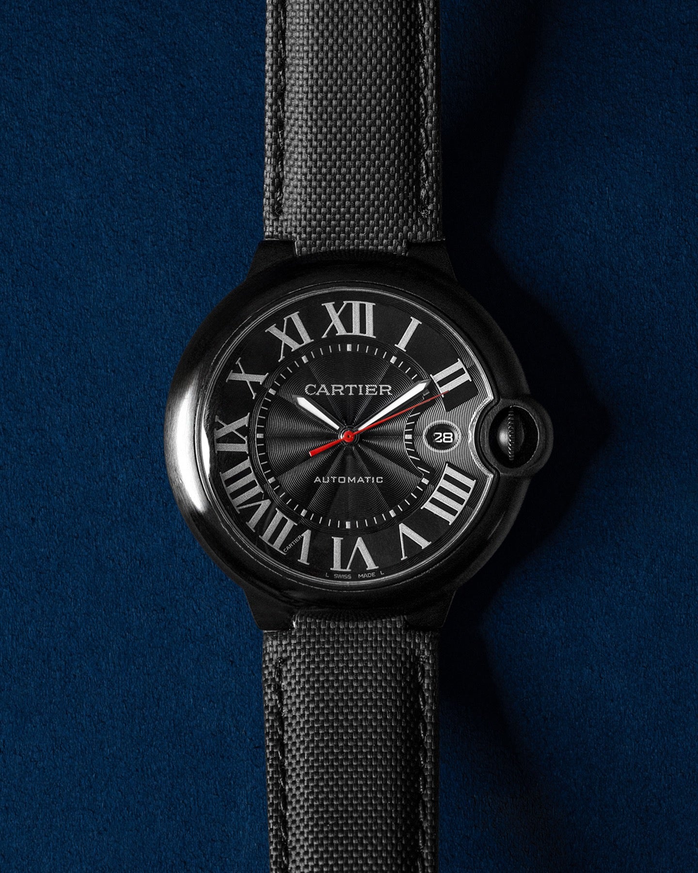 This Cartier Ballon Bleu WSBB0015 has a black roman numeral dial and a fabric strap. This Cartier has undergone a thorough inspection of accuracy, functionality and condition at our Cartier certified service centre to determine the level of reconditioning required to meet our strict standards. It has also been checked against our records to ensure authenticity. All our watches have a 24-month warranty for your peace of mind.