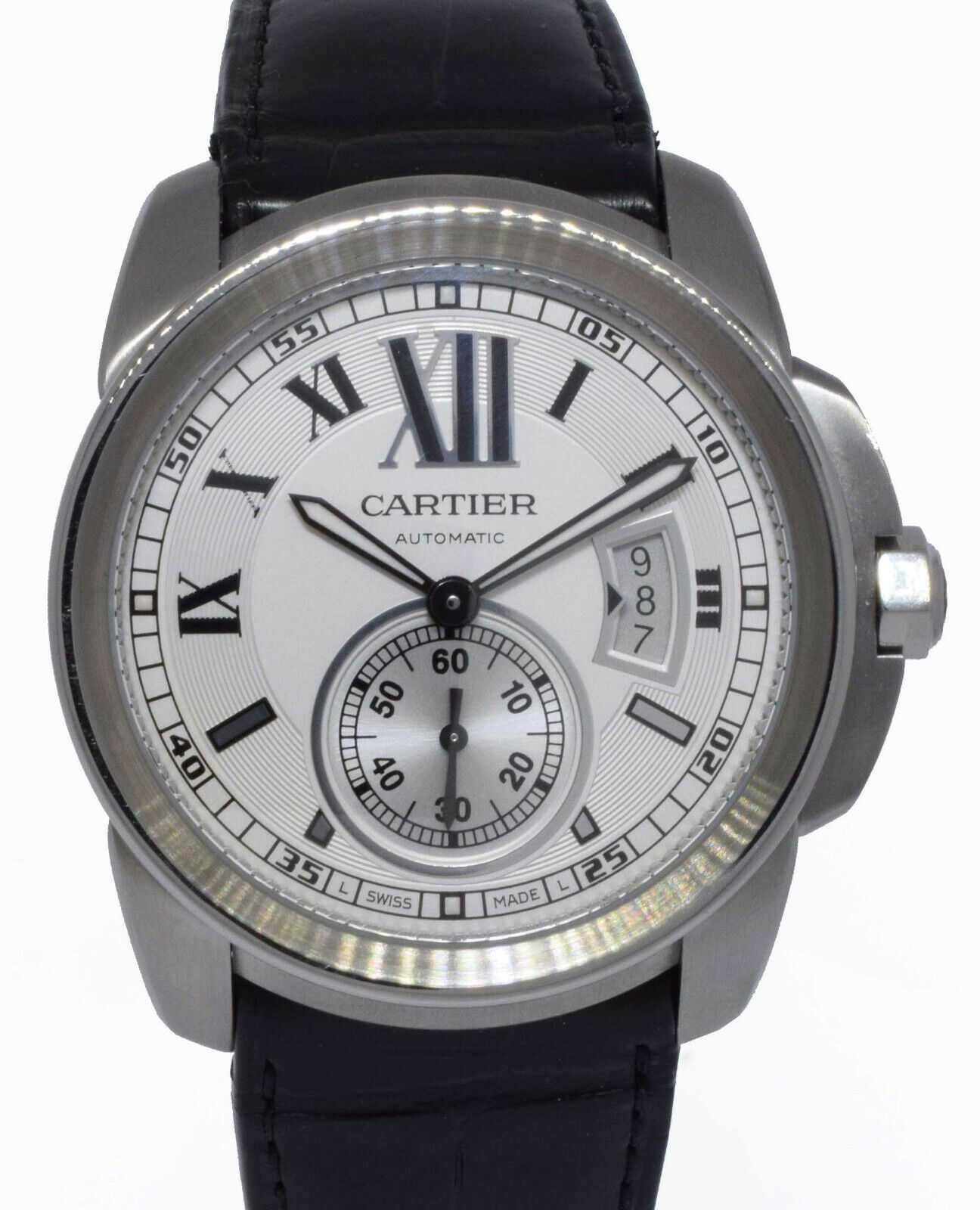 This Cartier Calibre De Cartier W7100037 has a white roman numeral dial and a leather strap. This Cartier has undergone a thorough inspection of accuracy, functionality and condition at our Cartier certified service centre to determine the level of reconditioning required to meet our strict standards. It has also been checked against our records to ensure authenticity. All our watches have a 24-month warranty for your peace of mind.