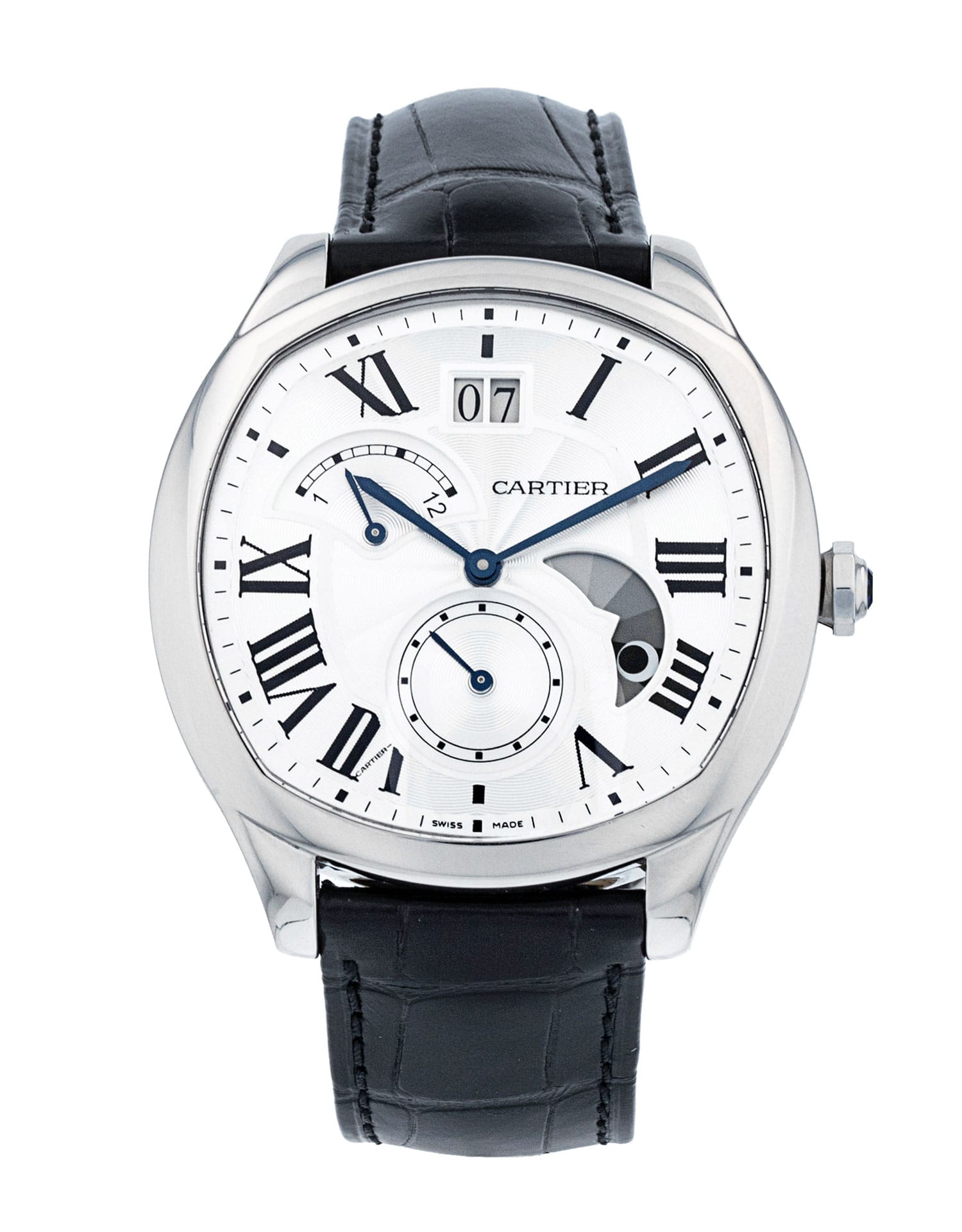 This Cartier Drive De Cartier WSNM0005 has a silver roman numeral dial and a leather strap. This Cartier has undergone a thorough inspection of accuracy, functionality and condition at our Cartier certified service centre to determine the level of reconditioning required to meet our strict standards. It has also been checked against our records to ensure authenticity. All our watches have a 24-month warranty for your peace of mind.