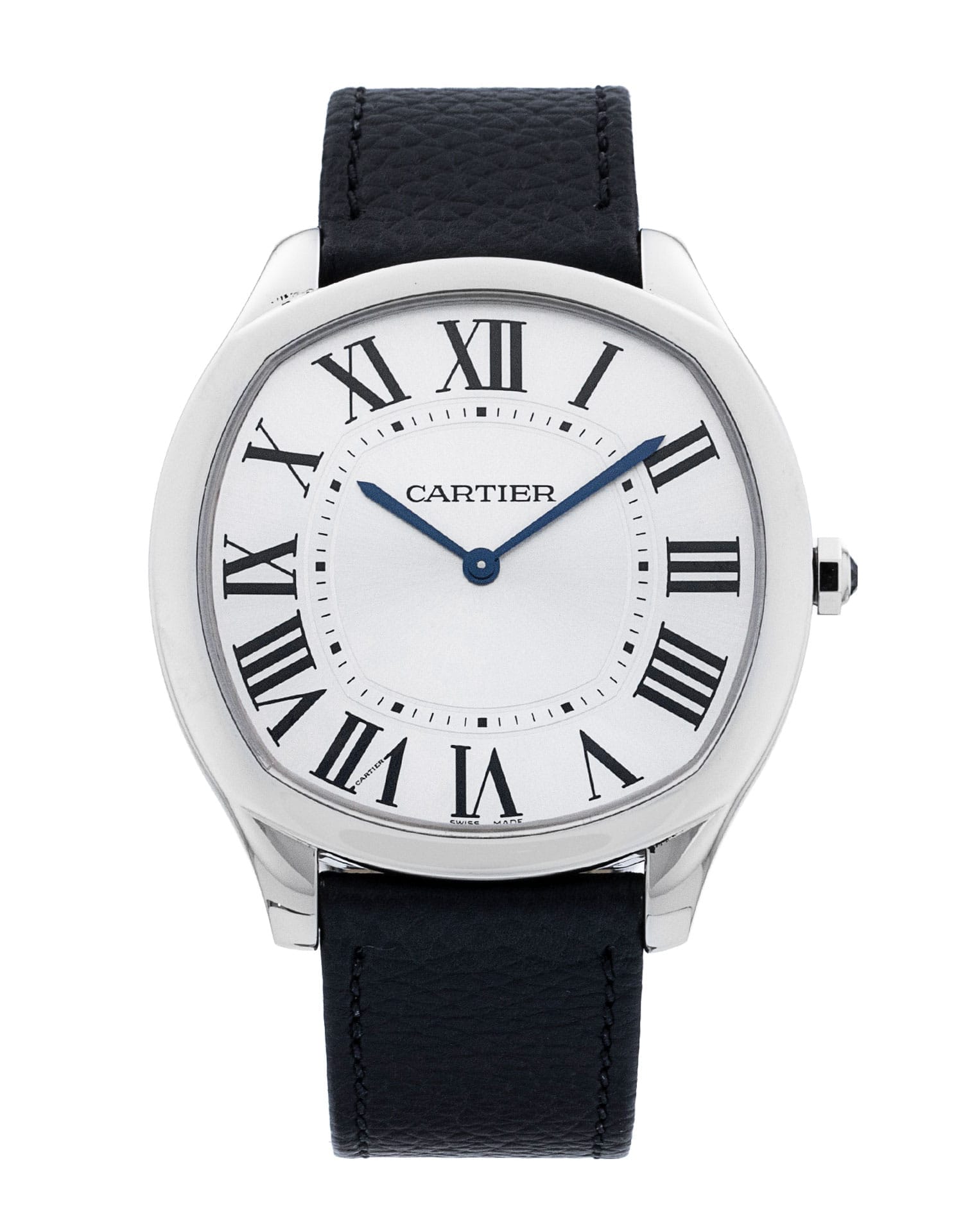 This Cartier Drive De Cartier WSNM0011 has a silver roman numeral dial and a leather strap. This Cartier has undergone a thorough inspection of accuracy, functionality and condition at our Cartier certified service centre to determine the level of reconditioning required to meet our strict standards. It has also been checked against our records to ensure authenticity. All our watches have a 24-month warranty for your peace of mind.