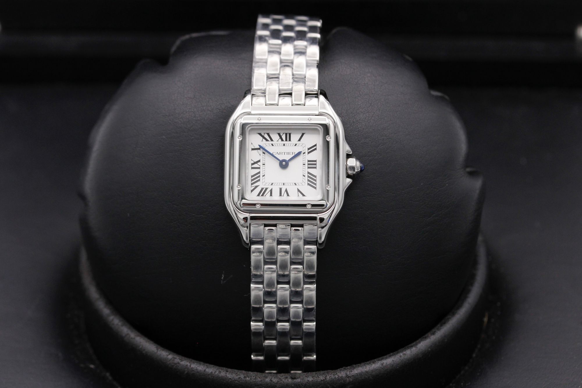 This Cartier Panthere De Cartier WSPN0013 has a silver roman numeral dial and a bracelet strap. This Cartier has undergone a thorough inspection of accuracy, functionality and condition at our Cartier certified service centre to determine the level of reconditioning required to meet our strict standards. It has also been checked against our records to ensure authenticity. Our watches have a 24-month warranty for your peace of mind, in conjunction with any remaining manufacturer’s warranty from new or from service.