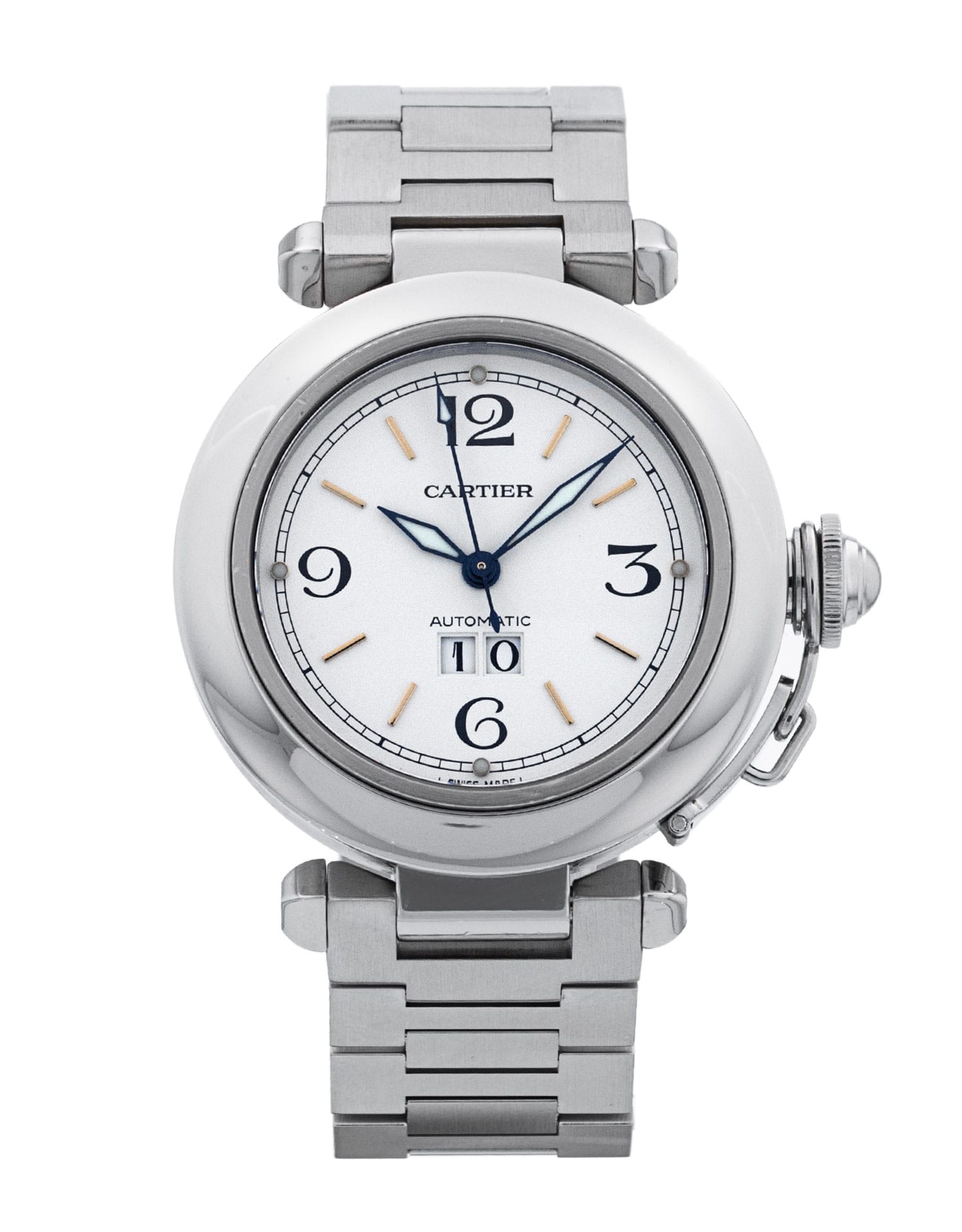 This Cartier Pasha W31044M7 has a white quarter arabic dial and a bracelet strap. This Cartier has undergone a thorough inspection of accuracy, functionality and condition at our Cartier certified service centre to determine the level of reconditioning required to meet our strict standards. It has also been checked against our records to ensure authenticity. All our watches have a 24-month warranty for your peace of mind.