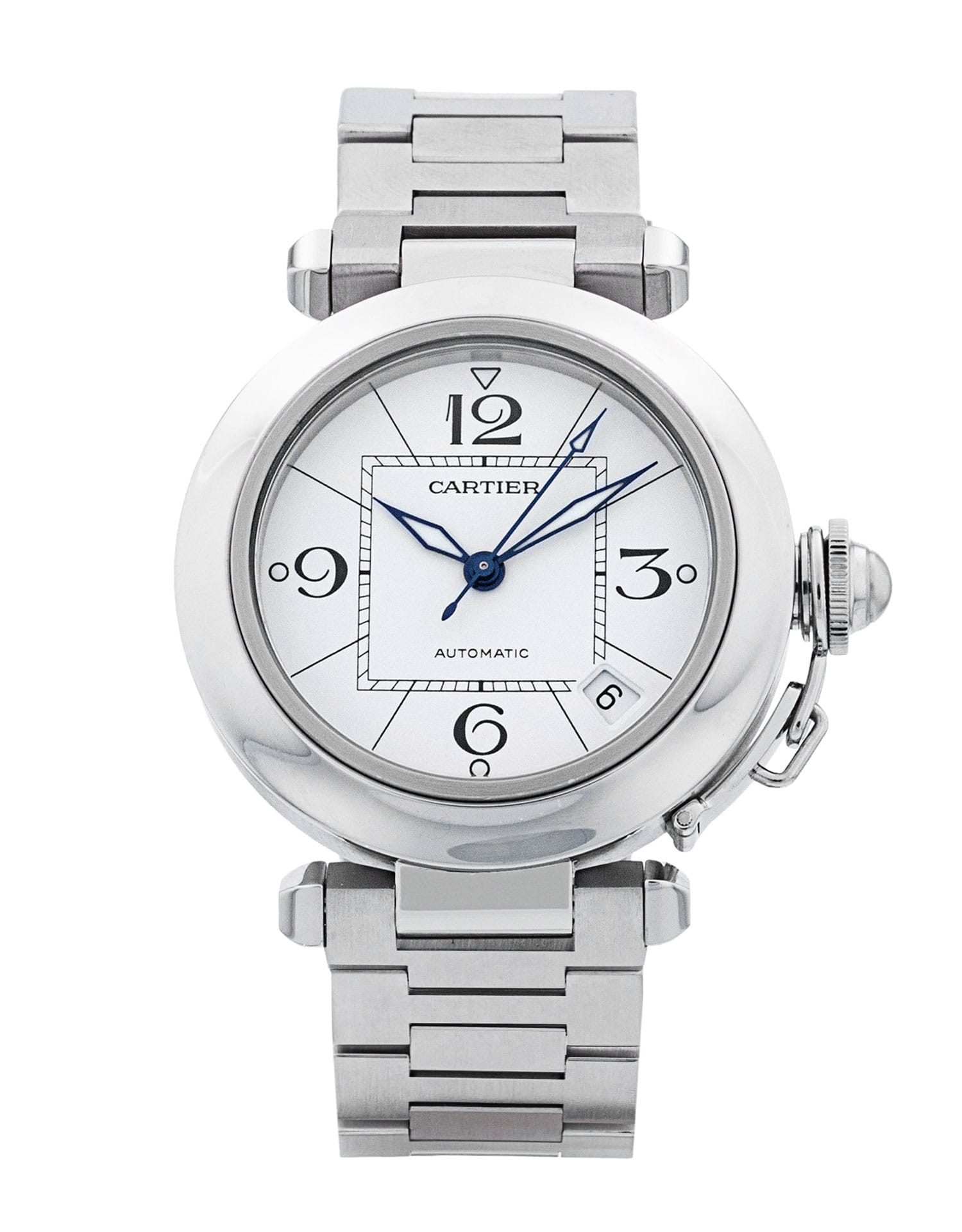This Cartier Pasha W31074M7 has a white quarter arabic dial and a bracelet strap. This Cartier has undergone a thorough inspection of accuracy, functionality and condition at our Cartier certified service centre to determine the level of reconditioning required to meet our strict standards. It has also been checked against our records to ensure authenticity. All our watches have a 24-month warranty for your peace of mind.