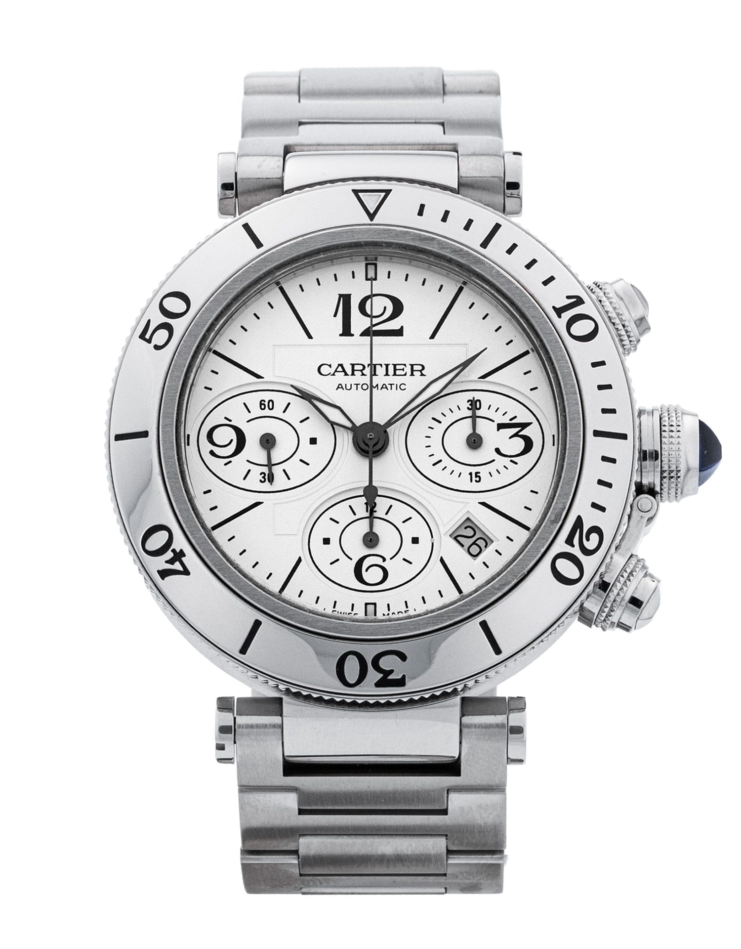 This Cartier Pasha W31089M7 has a white quarter arabic dial and a bracelet strap. This Cartier has undergone a thorough inspection of accuracy, functionality and condition at our Cartier certified service centre to determine the level of reconditioning required to meet our strict standards. It has also been checked against our records to ensure authenticity. All our watches have a 24-month warranty for your peace of mind.