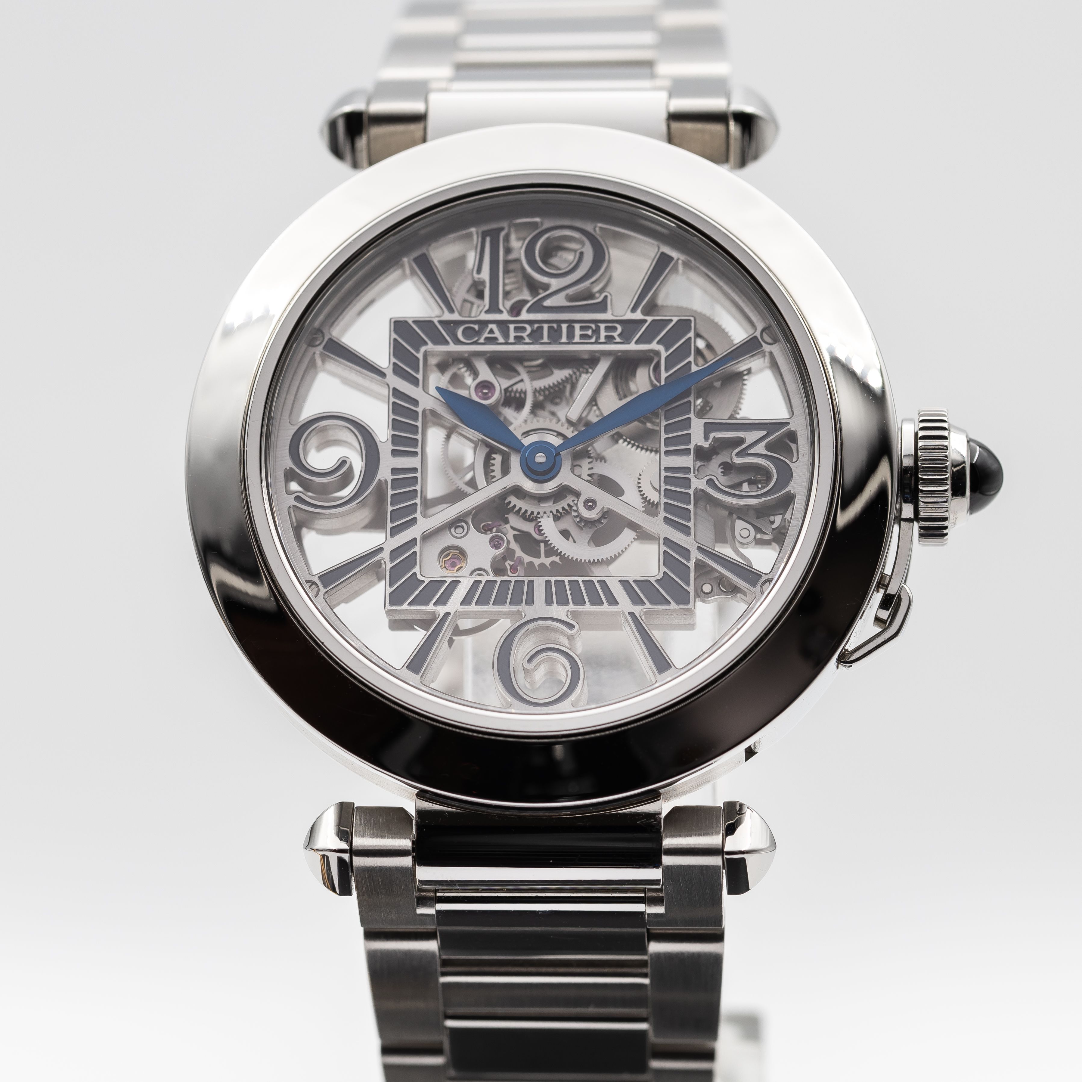 This Cartier Pasha WHPA0007 has a skeleton dial and a bracelet strap. This Cartier has undergone a thorough inspection of accuracy, functionality and condition at our Cartier certified service centre to determine the level of reconditioning required to meet our strict standards. It has also been checked against our records to ensure authenticity. Our watches have a 24-month warranty for your peace of mind, in conjunction with any remaining manufacturer’s warranty from new or from service.