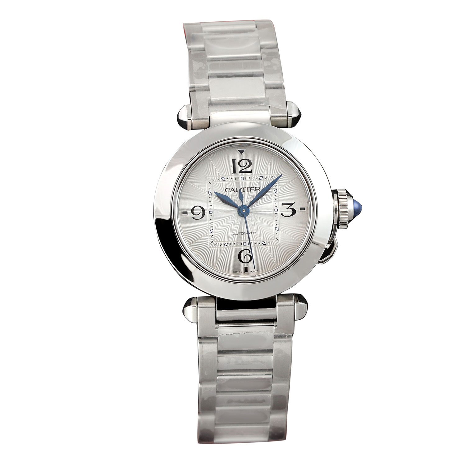 This Cartier Pasha WSPA0013 has a silver quarter arabic dial and a bracelet strap. This Cartier has undergone a thorough inspection of accuracy, functionality and condition at our Cartier certified service centre to determine the level of reconditioning required to meet our strict standards. It has also been checked against our records to ensure authenticity. All our watches have a 24-month warranty for your peace of mind.