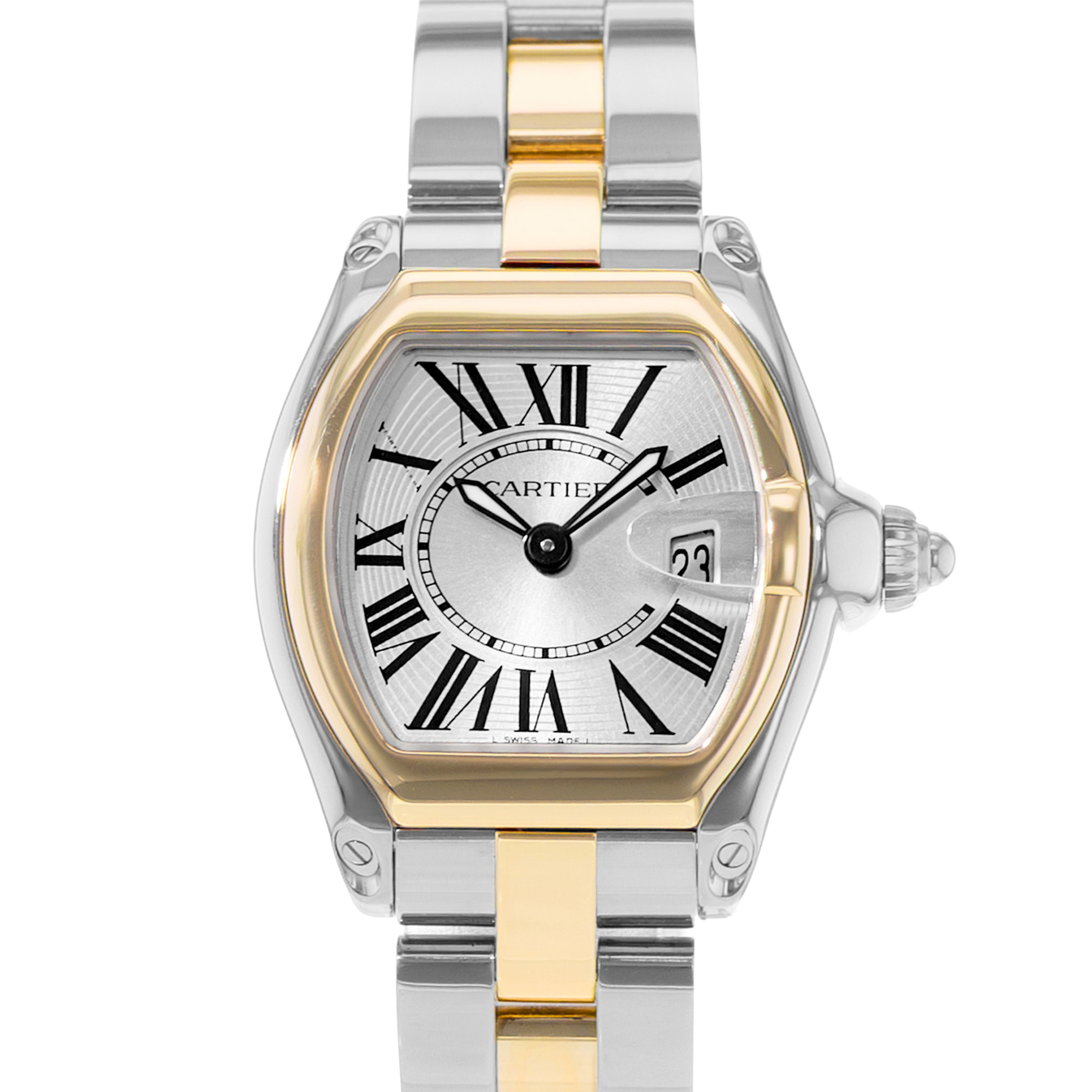 This Cartier Roadster W62026Y4 has a silver roman numeral dial and a bracelet strap. This Cartier has undergone a thorough inspection of accuracy, functionality and condition at our Cartier certified service centre to determine the level of reconditioning required to meet our strict standards. It has also been checked against our records to ensure authenticity. All our watches have a 24-month warranty for your peace of mind.