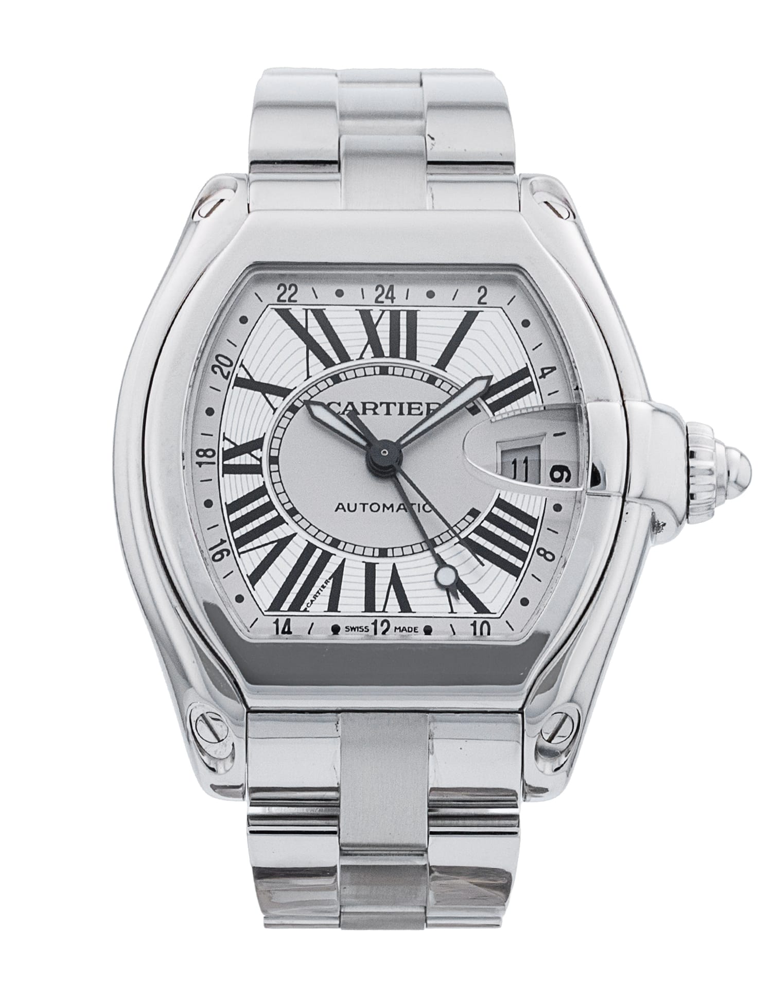 This Cartier Roadster W62032X6 has a silver roman numeral dial and a bracelet strap. This Cartier has undergone a thorough inspection of accuracy, functionality and condition at our Cartier certified service centre to determine the level of reconditioning required to meet our strict standards. It has also been checked against our records to ensure authenticity. All our watches have a 24-month warranty for your peace of mind.